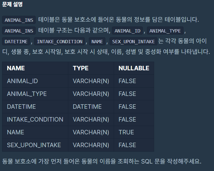 SELECT NAME FROM ANIMAL_INS ORDER BY DATETIME LIMIT 1