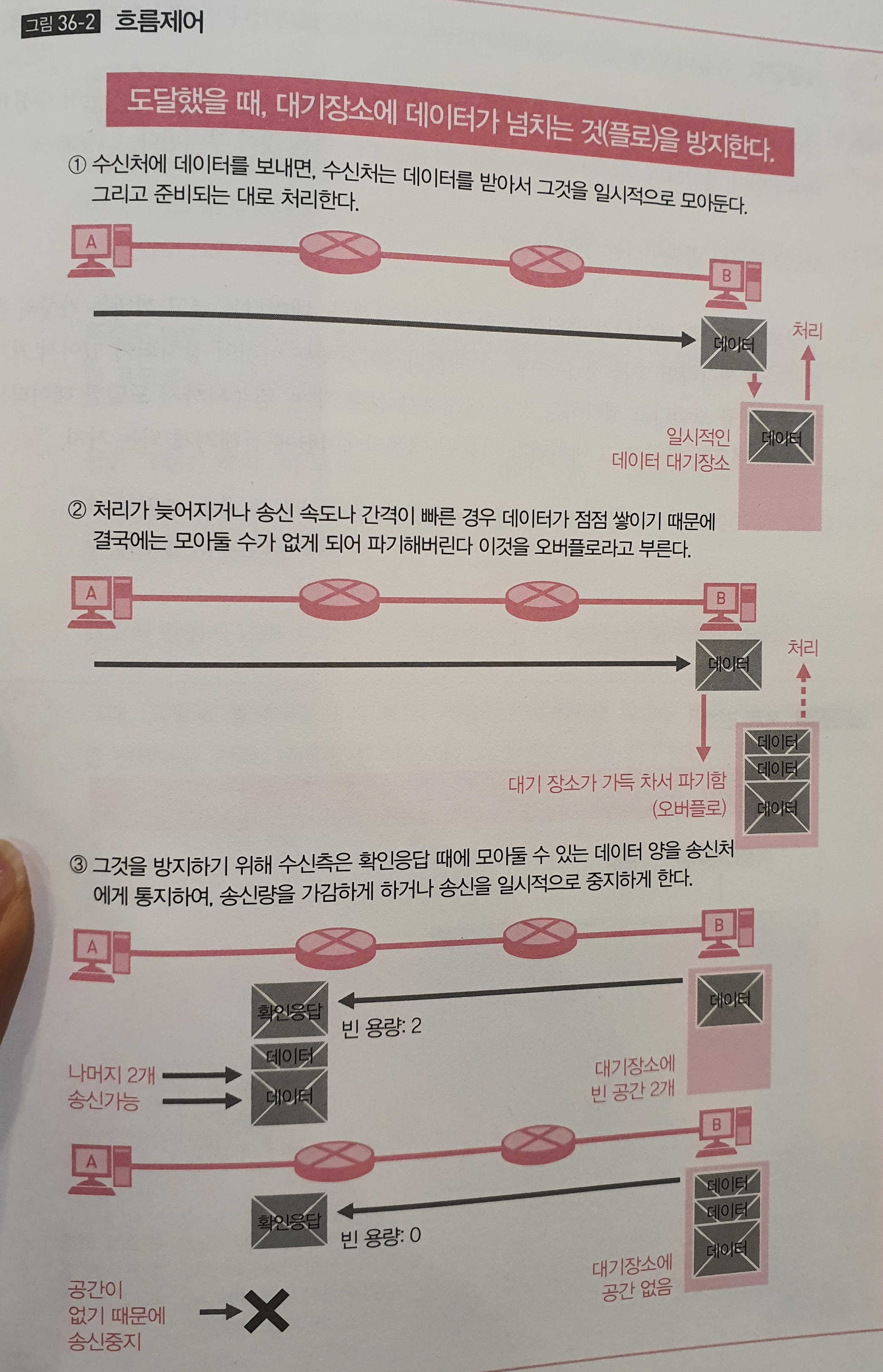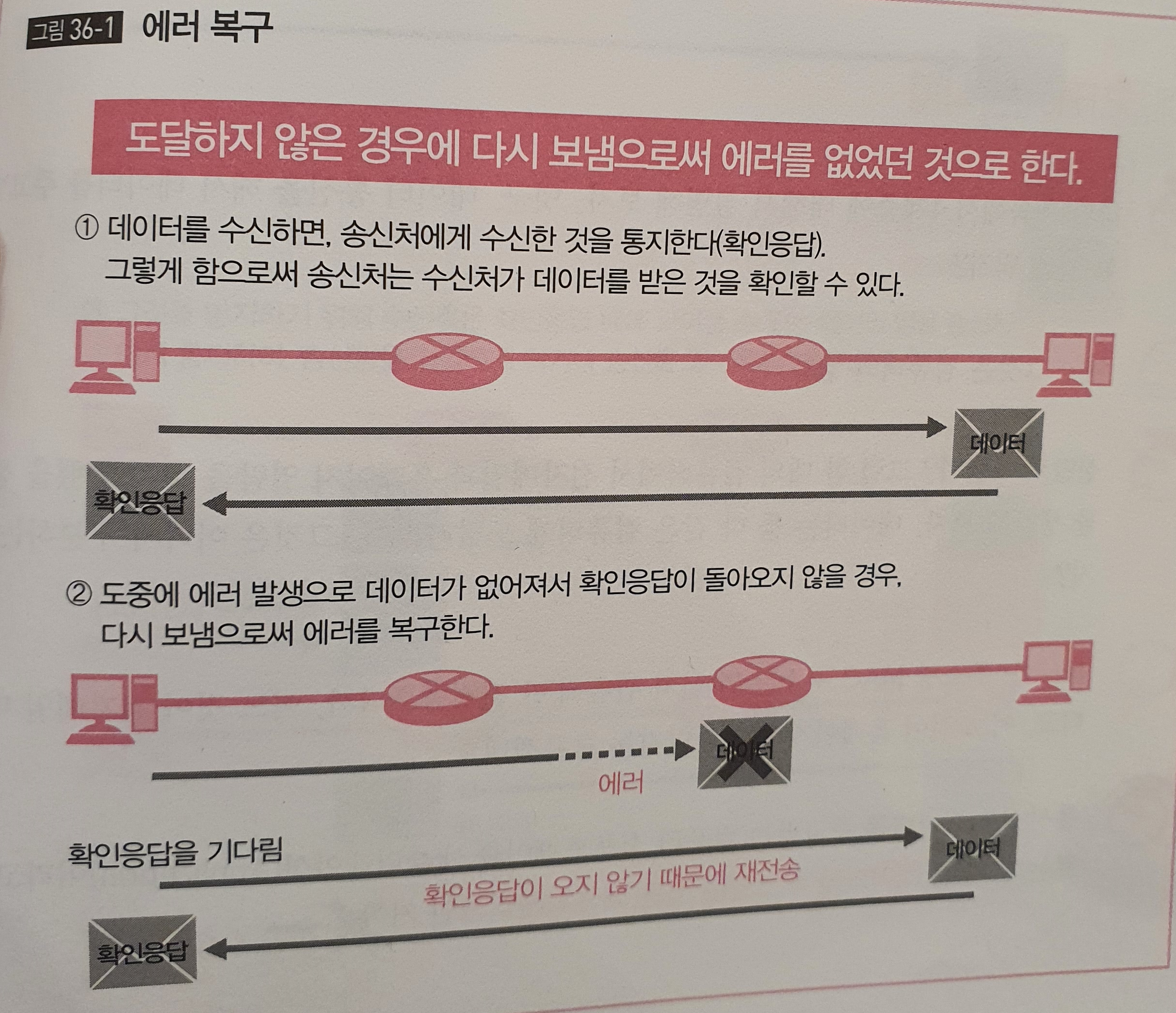 흐름제어 : 신뢰성이 높은 통신을 위해서 에러를 복구하고 통신 상태도 확인한다.(역할2)