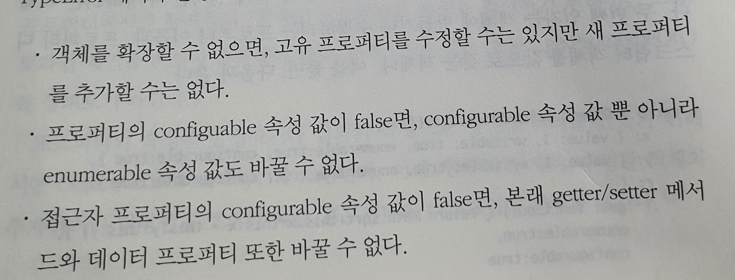 프로퍼티 이름과 그 값 뿐 아니라, 프로퍼티 그 자체를 결정하는 세 가지 속성 writable과 enumerable, configurable이 있다. writable 속성은 프로퍼티 값의 변경 여부를 결정한다. enumerable 속성은 프로퍼티가 열거될 수 있는지 여부를 결정하고, configurable 속성은 configurable 속성 뿐 아니라 writable 속성과 enumerable 속성 값의 변경 여부를 결정한다.