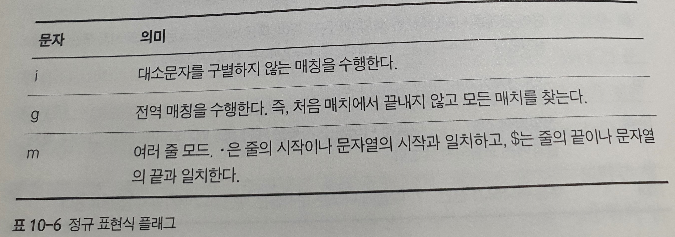 RegExp() 생성자는 하나 또는 두 개의 문자열을 인자로 받고 새로운 RegExp() 객체를 생성한다. 이 생성자에 전달되는 첫 번째 인자는 정규 표현식의 본문이다. 두번째 인자는 생략할 수 있다. 만약 인자를 지정하면 이는 정규 표현식 플래그를 의미하고 g,i,m 또는 이 문자들의 조합이어야 한다.