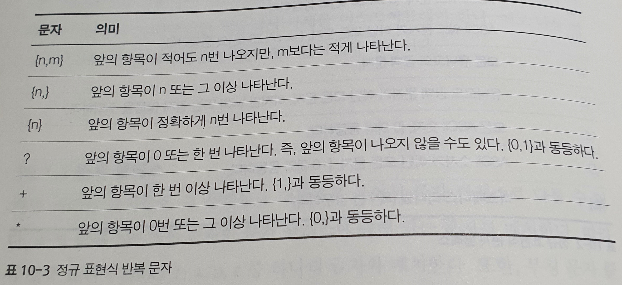 지금까지 배운 정규 표현식 문법을 사용하면 여러분은 두 자리 숫자를 /\d\d/로 표현할 수 있다. 그러나 임의 자리의 수 또는 세 개의 문자가 있고 뒤이어 생략 가능한 숫자로 이루어진 문자열을 표현하기는 어려울 것이다. 이런 식으로 더 복잡한 패턴은 정규 표현식의 요소가 몇 번이나 반복되는지를 나타내는 문법을 사용한다.
