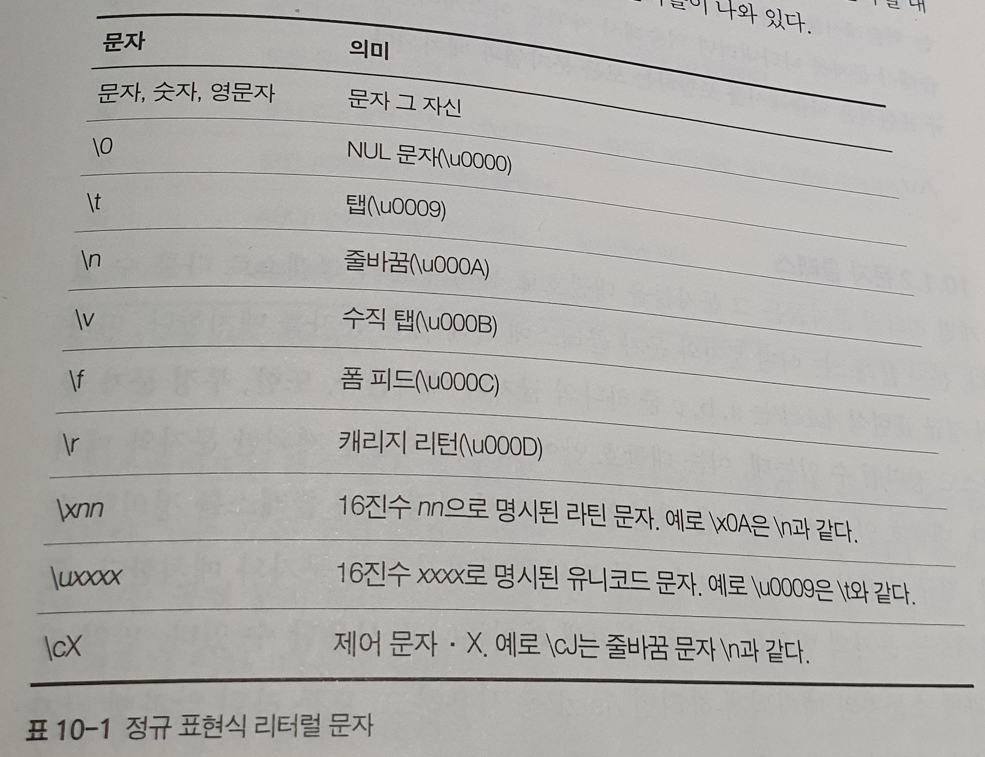 모든 영문자와 숫자는 그 문자 그대로 정규 표현식에서 매치된다. 알파벳이 아닌 문자들은 역슬래시로 시작하는 이스케이프 문자열을 통해 지원한다.