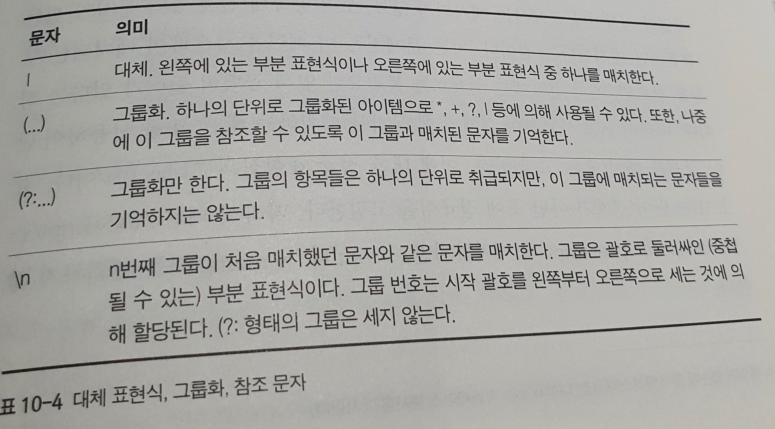 ex) /java(script)?/는 "java"와 그다음에 생략 가능한 "script"가 오는 문자열과 매치된다.