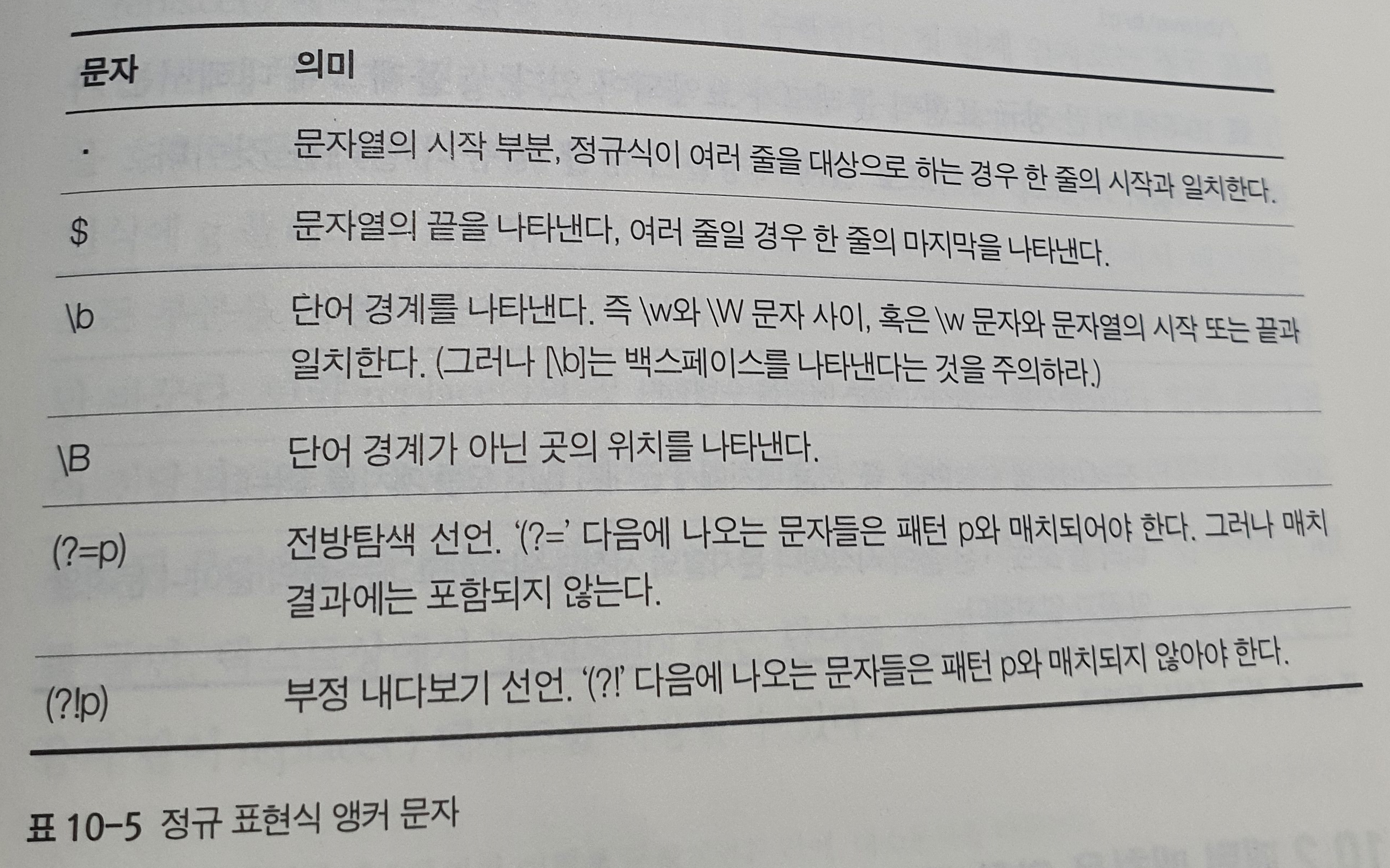 정규 표현식 앵커 : 요소들이 검색할 문자열의 특정 위치에 정규식을 고정