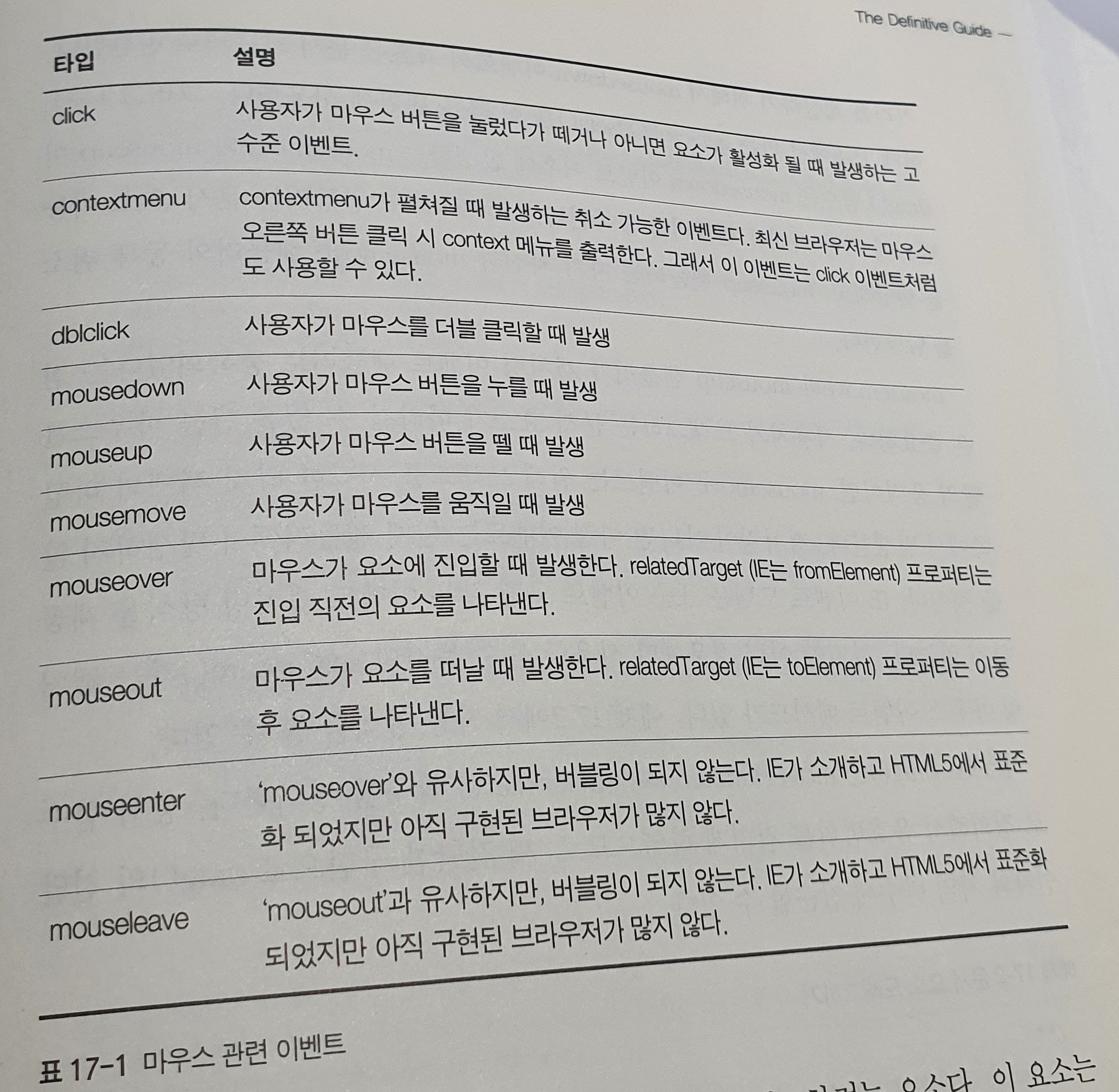 마우스 관련 이벤트는 사용자가 문서 위에서 마우스를 클릭하거나 움직일 때 발생한다. 이런 이벤트는 마우스 포인터가 올려져 있는 가장 깊숙한 안쪽 요소에서 발생하지만, 문서 계층 구조를 따라서 버블링된다. 마우스 이벤트 핸들러에 전달되는 이벤트 객체에는 마우스의 위치와 버튼 상태, 이벤트 핸들러에 전달되는 이벤트 객체에는 마우스의 위치와 버튼 상태, 이벤트 발생시 옵션키가 같이 눌렸는지를 나타내는 프로퍼티 모음이 들어있다.