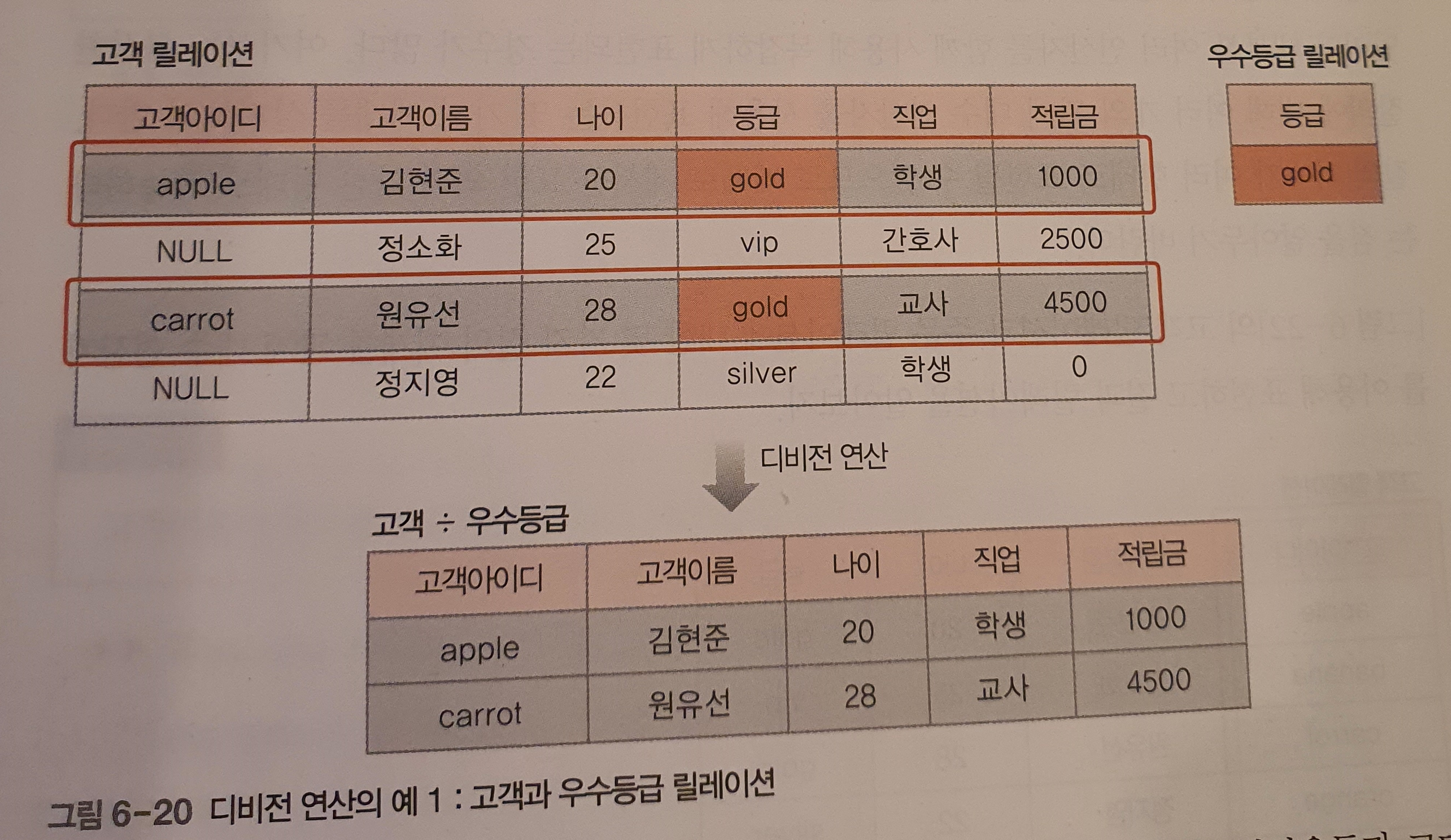 데이터를 처리하는 기능과 처리를 요구하는 표현력에서 관계 대수와 관계 해석은 능력이 모두 동일하다. 실제 사용법은 7장에서 대푲거 비절차 언어인 SQL을 통해 이해하자
