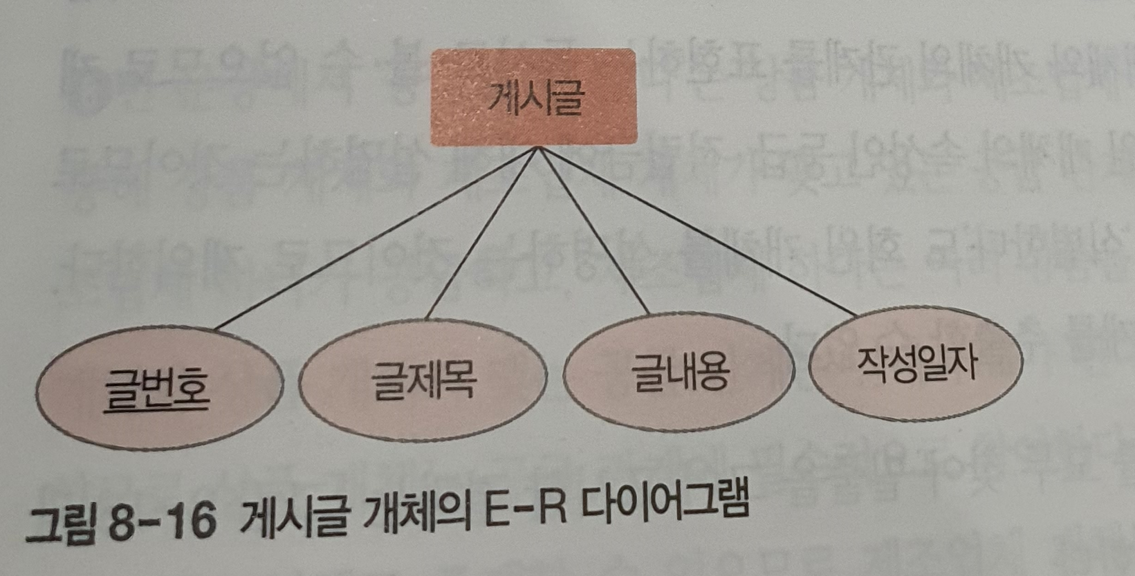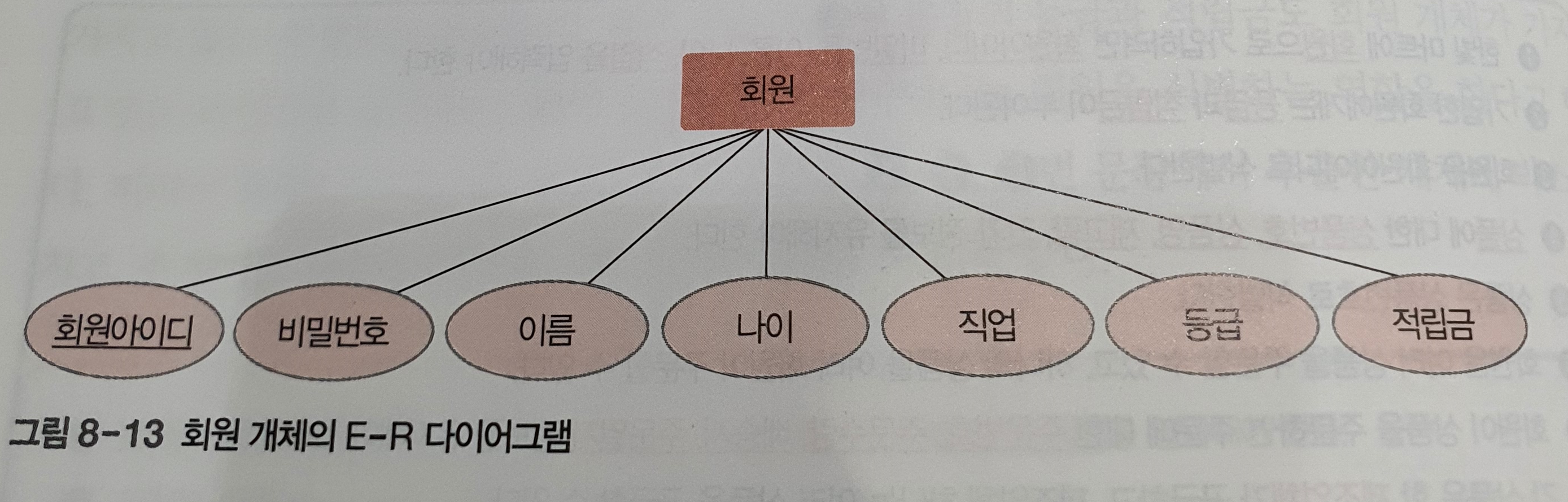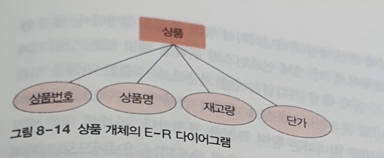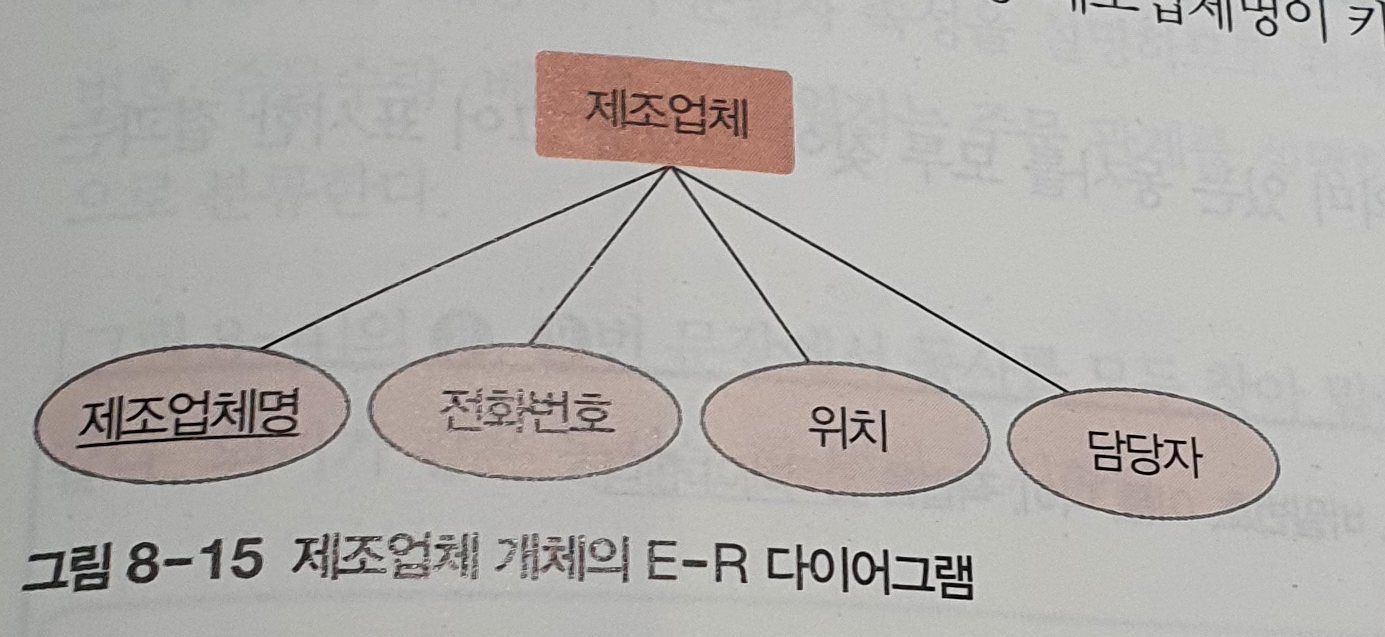 개념적 설계의 최종 결과물은 E-R 다이어그램으로 작성해야 한다. 따라서 요구 사항 명세서에서 추출한 개체와 속성을 E-R 다이어그램으로 표현해두는 것이 좋다. E-R 다이어그램에서 개체는 사각형으로, 속성은 타원형으로 표현한다. 그리고 키 속성은 이름에 밑줄을 그어 표시한다.