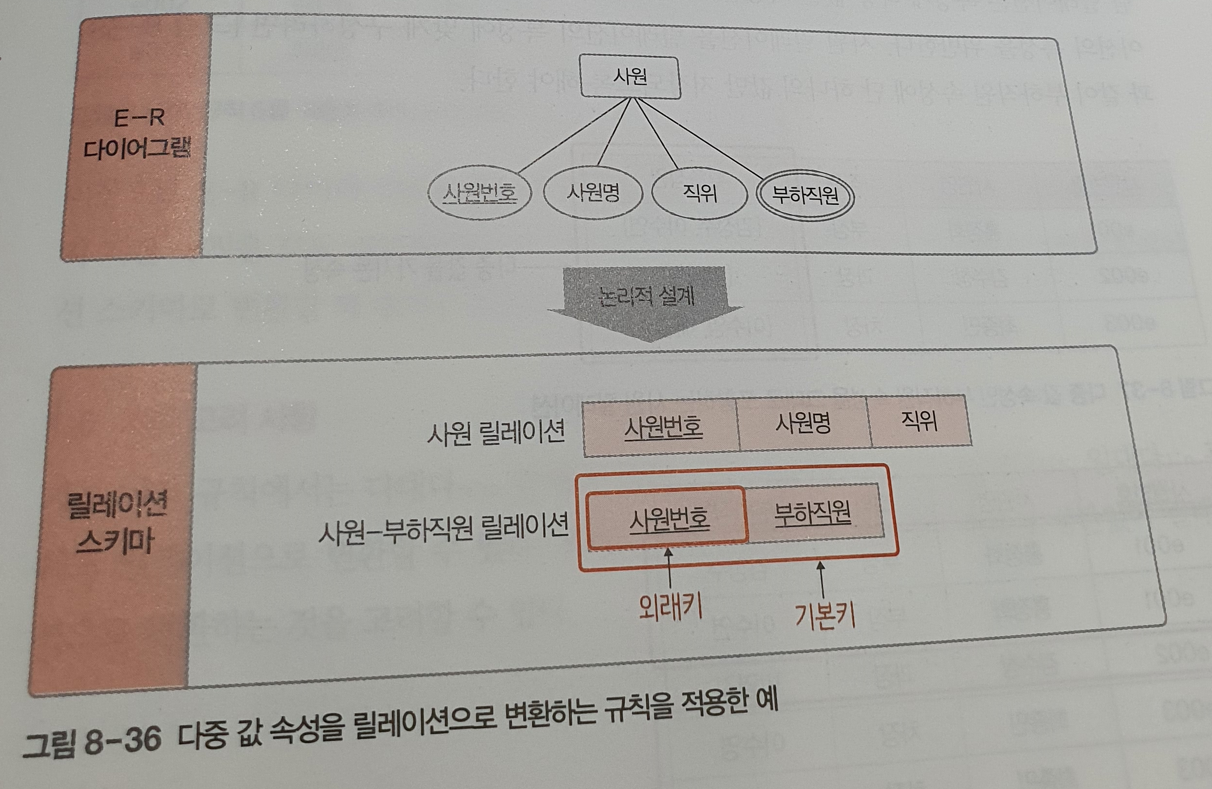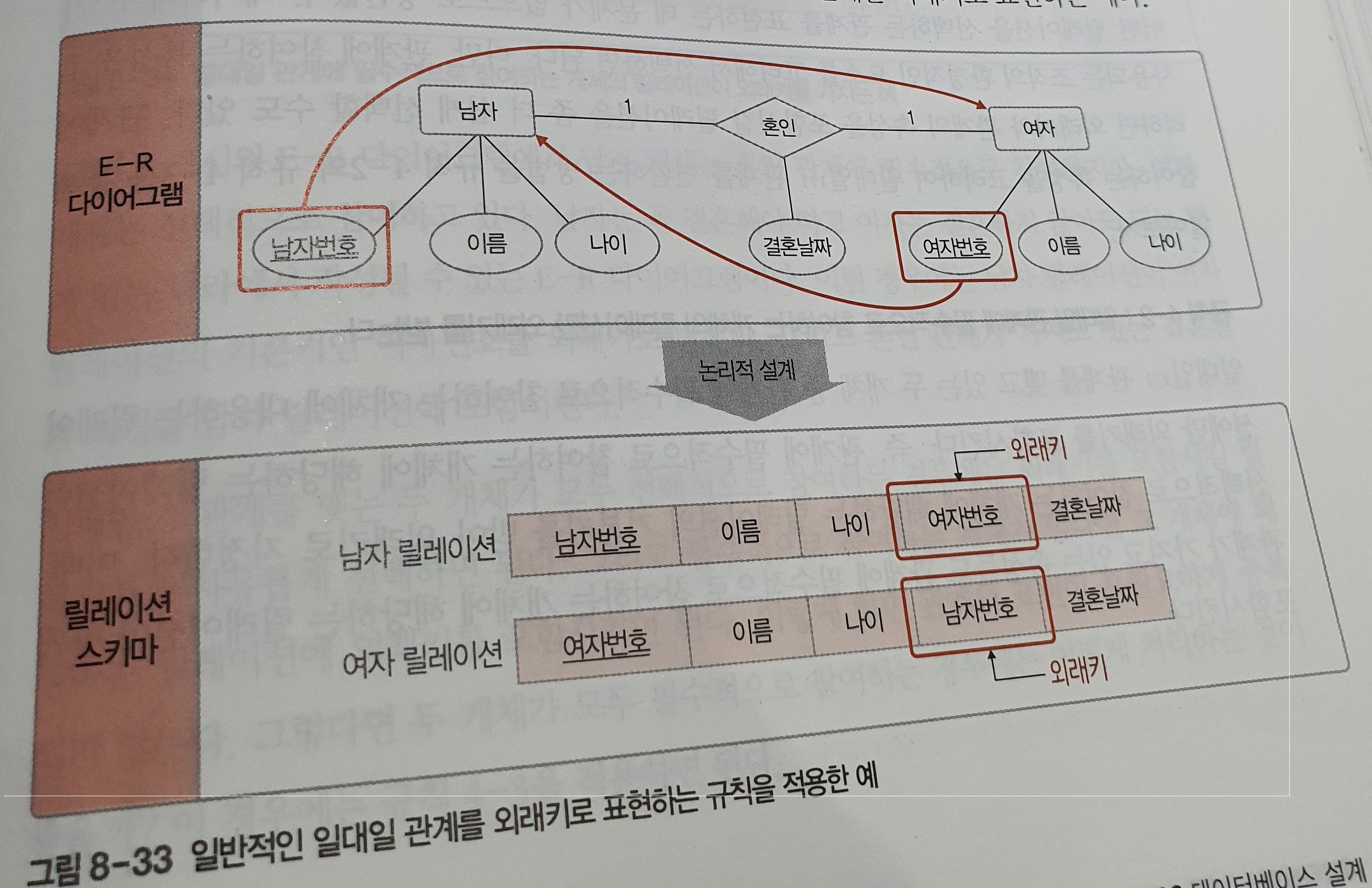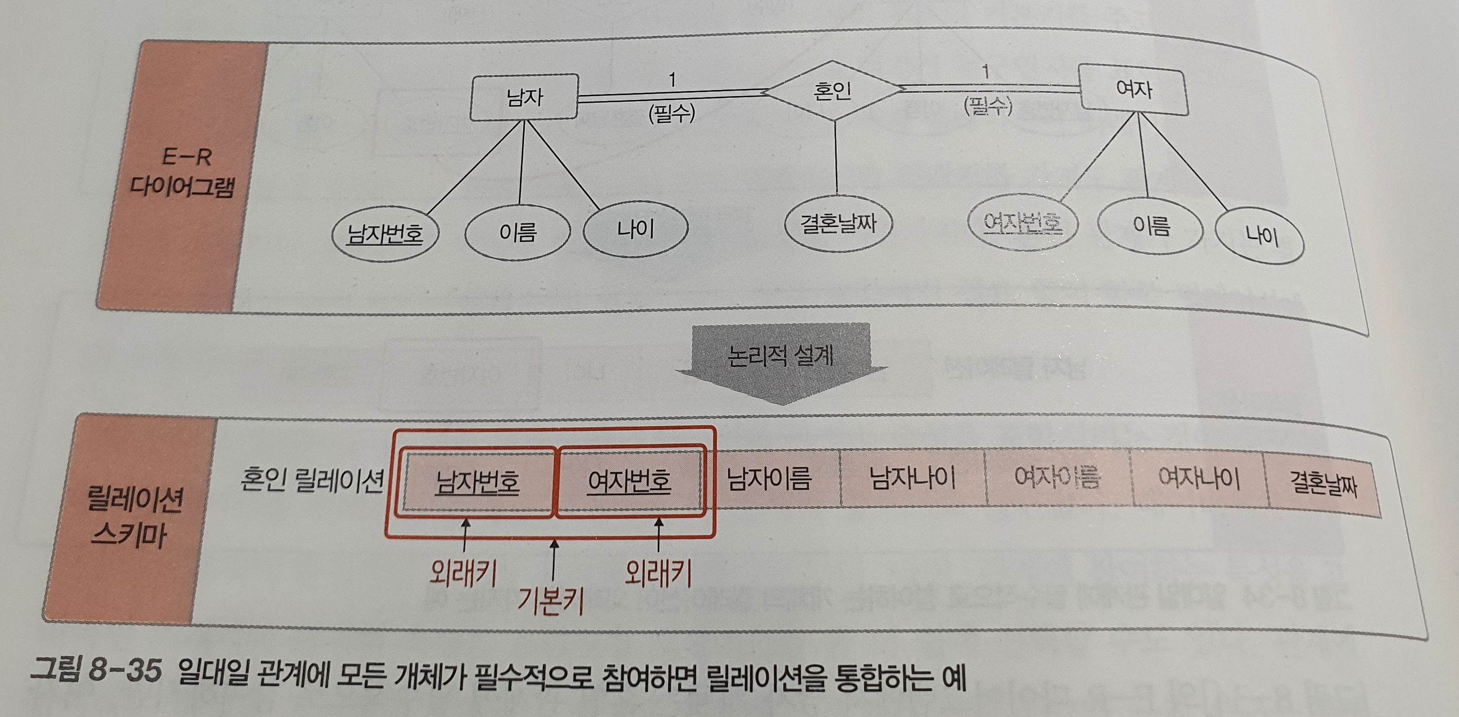E-R 다이어그램을 릴레이션 스키마로 변경하는 것은 쉽지 않다. 다섯가지 규칙을 순서대로 적용하면 쉽게 변환할 수 있다. 이렇게 설계한 후에 9장에서 배울 정규화 과정을 통해 이상 현상이 발생하지 않도록 검증하는 작업을 수행하는 것이 좋다.