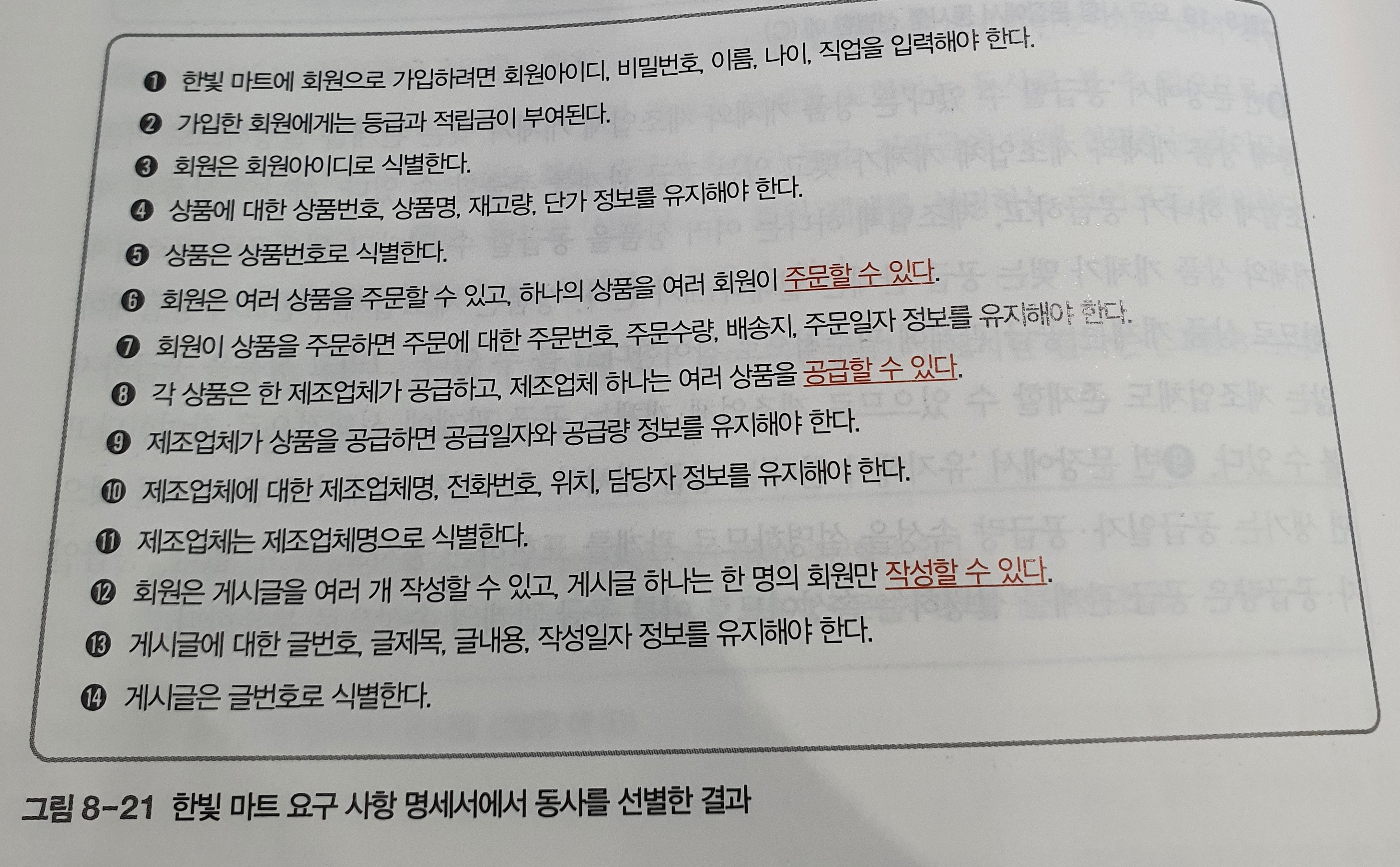 요구 사항의 분석 결과를 E-R 모델을 이용해 개념적 모델링을 하려면 먼저 E-R 모델의 핵심 요소인 개체를 추출해야 한다. 그다음 각 개체의 주요 속성과 키 속성을 선별하고, 개체 간의 관계를 결정해야 한다. 개체, 속성, 관계를 선별하는 작업이 모두 완료되면 그 결과를 E-R 다이어그램으로 표현한다.