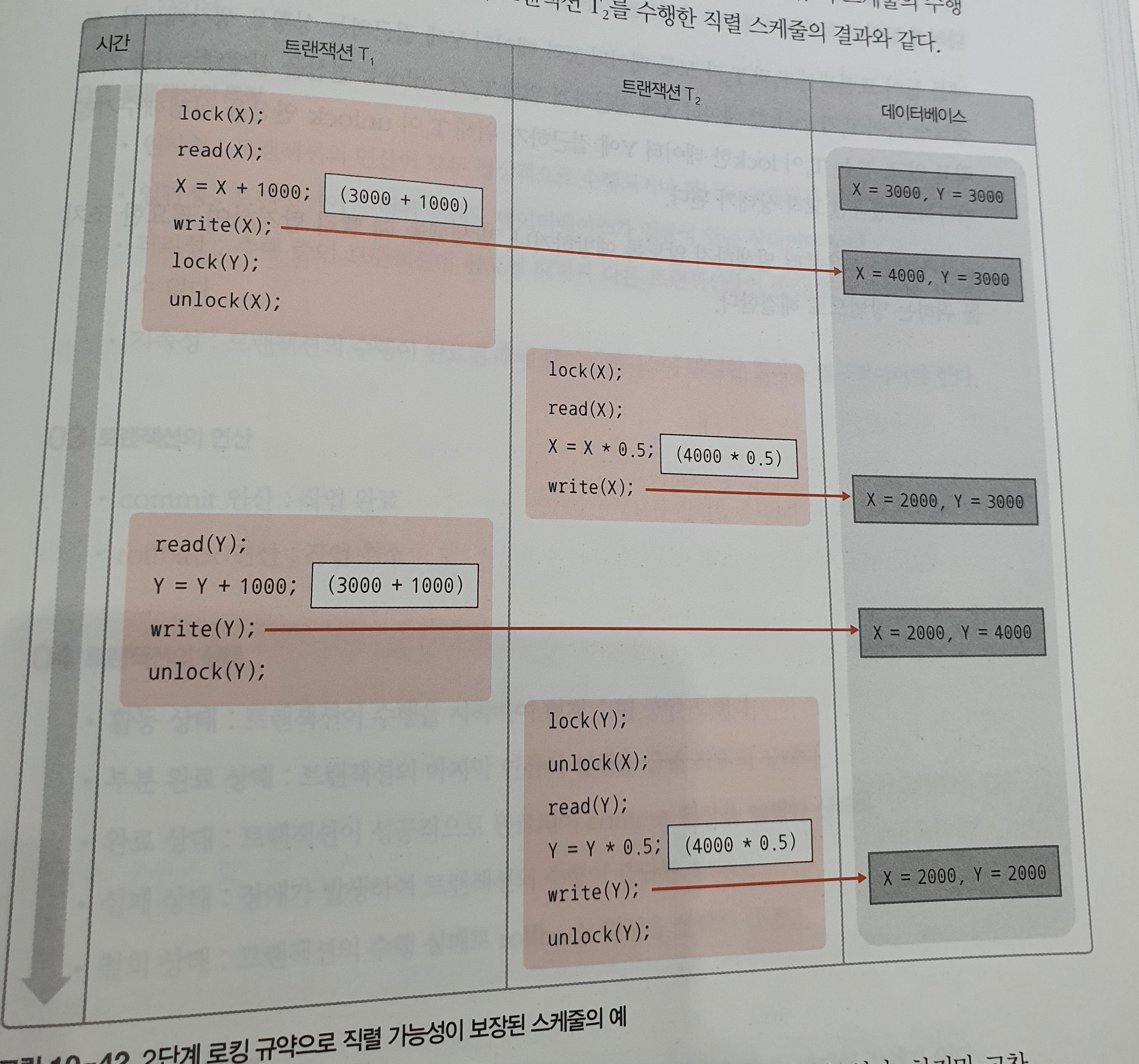 기본 로킹 규약의 문제를 해결하고 트랜잭션의 직렬 가능성을 보장하기 위해 lock과 unlock 연산의 수행 시점에 대한 새롱누 규약 을 추가한 것이 2단계 로킹 규약이다. 2단계 로킹 규약을 따르려면 모든 트랜잭션이 lock과 unlock 연산을 다음과 같이 2단계로 나누어 실행해야 한다.