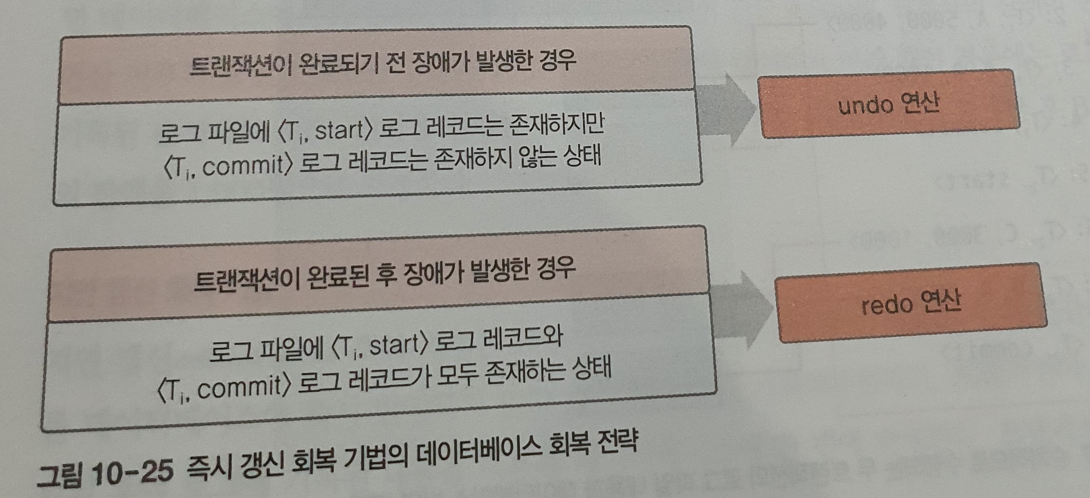 즉시 갱신 회복 기법은 트랜잭션 수행 중에 데이터를 변경한 연산의 결과를 데이터베이스에 즉시 반영한다. 그리고 장애 발생에 대비하기 위해 데이터 변경에 대한 내용을 로그 파일에도 기록한다. 데이터베이스 회복 시 로그를 정상적으로 사용하려면, 트랜잭션에서 데이터 변경 연산이 실행되었을 때 로그 파일에 로그 레코드를 먼저 기록한 후 데이터베이스에 변경 연산을 반영해야 한다.