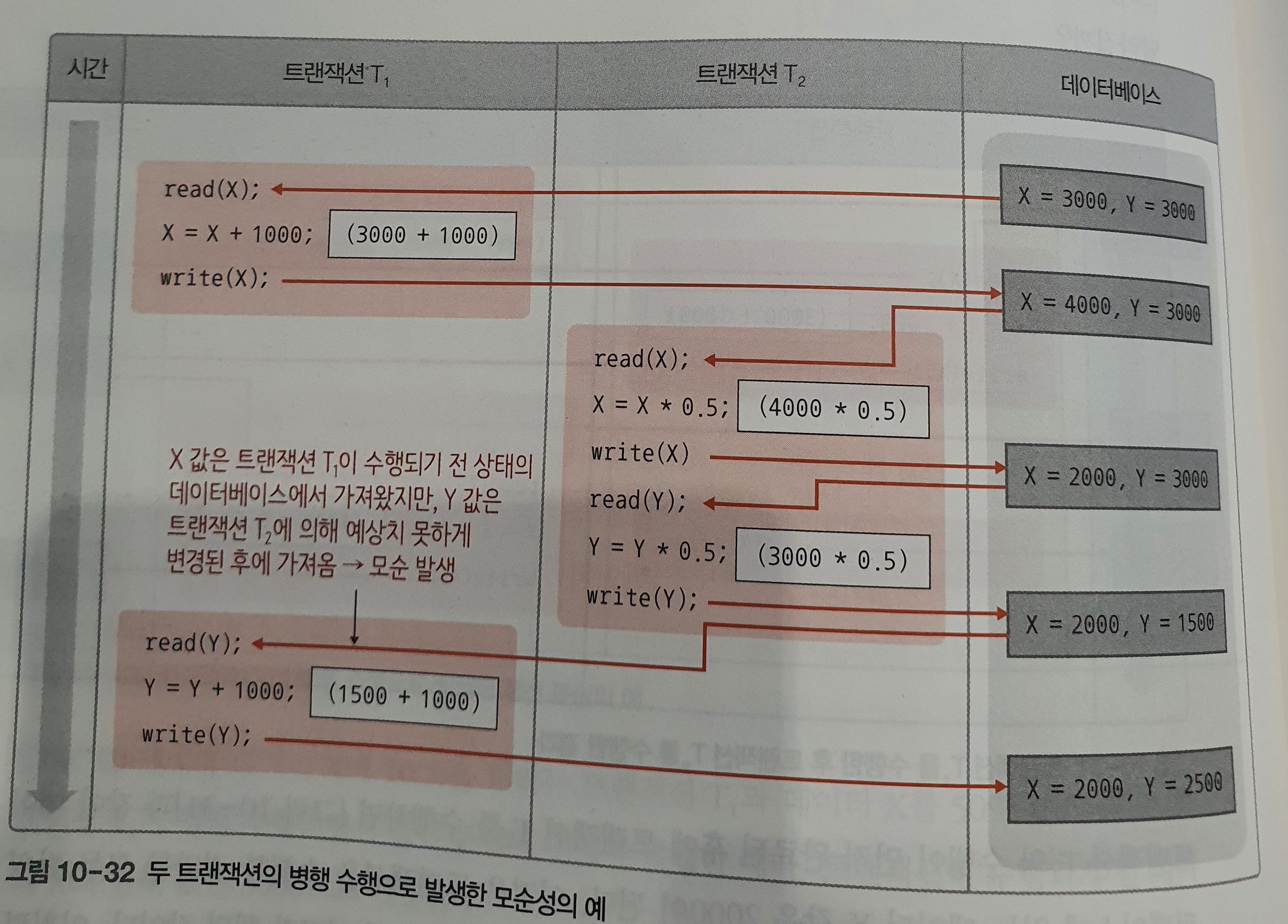 모순성은 하나의 트랜잭션이 여러 개의 데이터 변경 연산을 실행할 때 일관성 없는 상태의 데이터베이스에서 데이터를 가져와 연산을 실행함으로써 모순된 결과가 발생하는 것이다.
