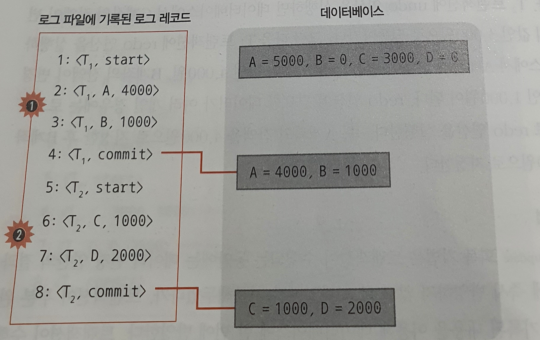 <T1, start>, <T1, commit>로그 레코드가 모두 존재하므로 T1 트랜잭션에 redo(T1) 연산을, T2 트랜잭션에 undo(T2) 연산을 실행해야 한다. 이렇게 회복을 위해 redo, undo 연산이 모두 필요할 때는 undo 연산을 먼저 실행한 후 redo 연산을 실행한다.