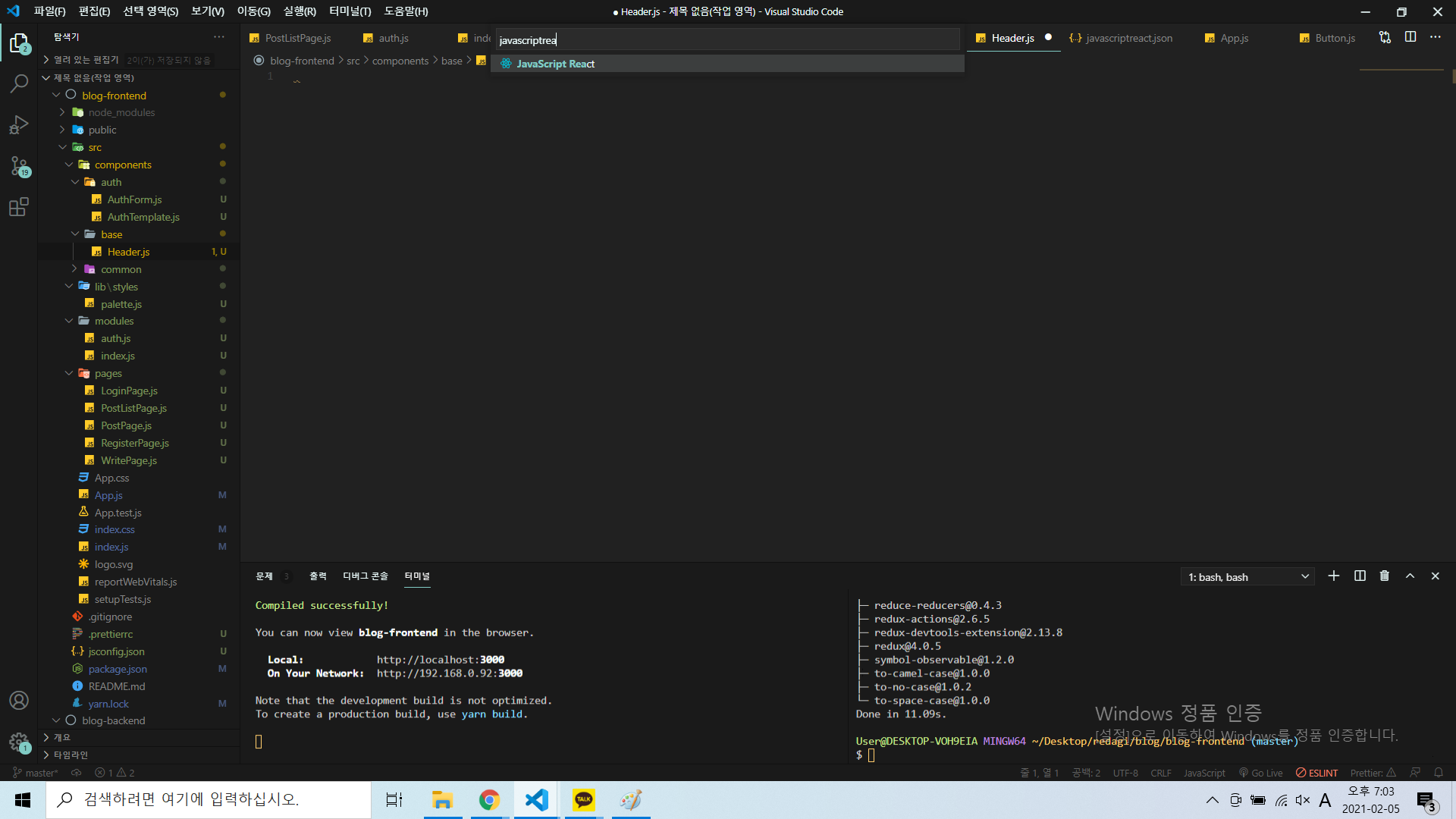 javascriptreact 입력하면 javascriptreact.json파일이 나오는데 거기에 위에 복사한 내용 붙여넣기