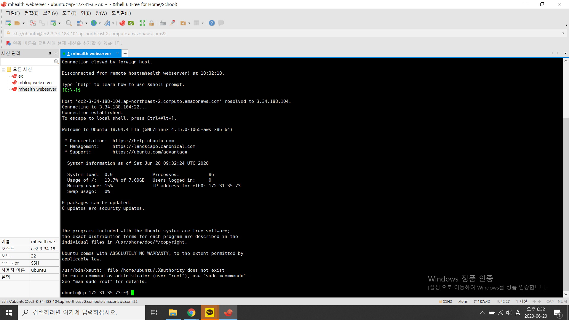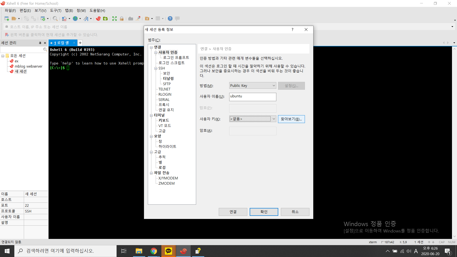 저는 xshell6을 사용해서 윈도우에서 리눅스 인스턴스로 접속하겠습니다.