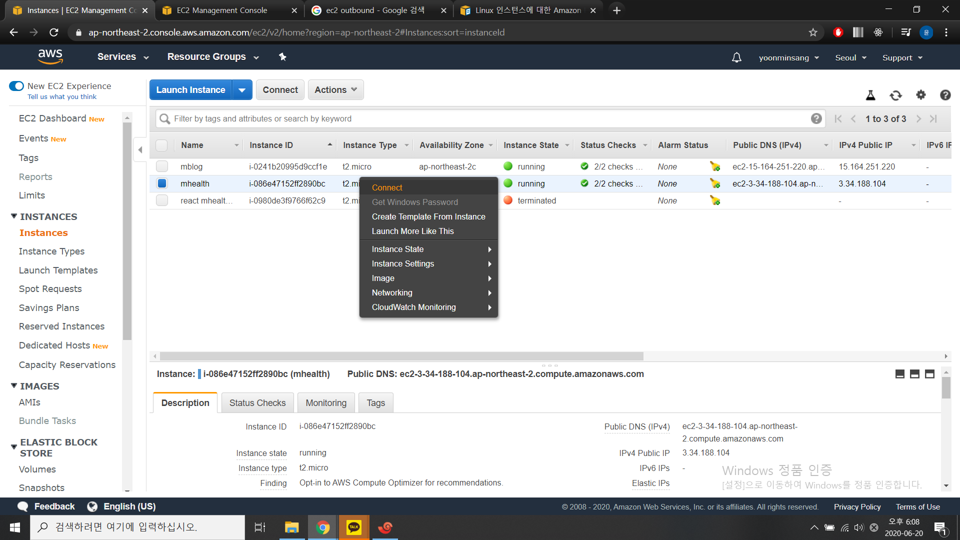 이전 글에서 생성한 인스턴스에서 오른쪽 클릭을 한 후에 connect를 선택합니다.