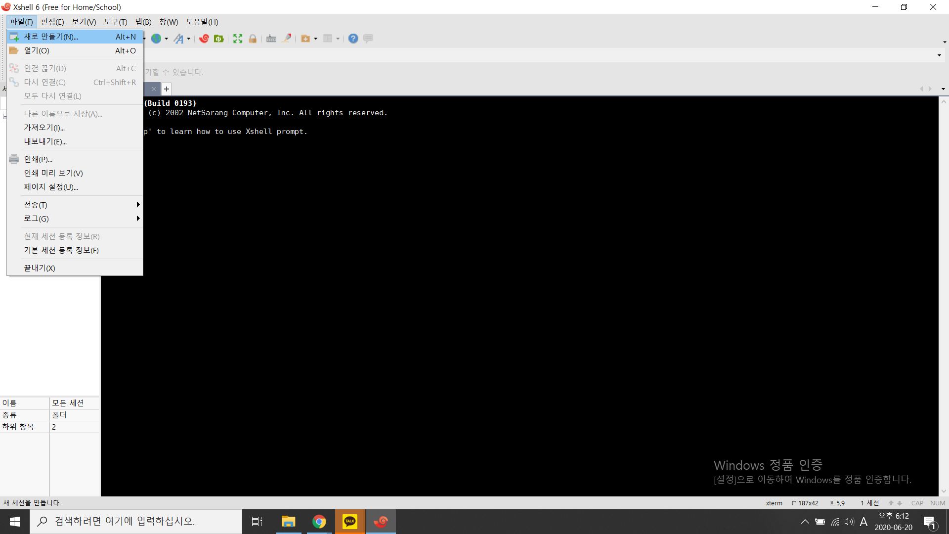 xshell을 들어가서 파일/새로만들기에 들어갑니다.