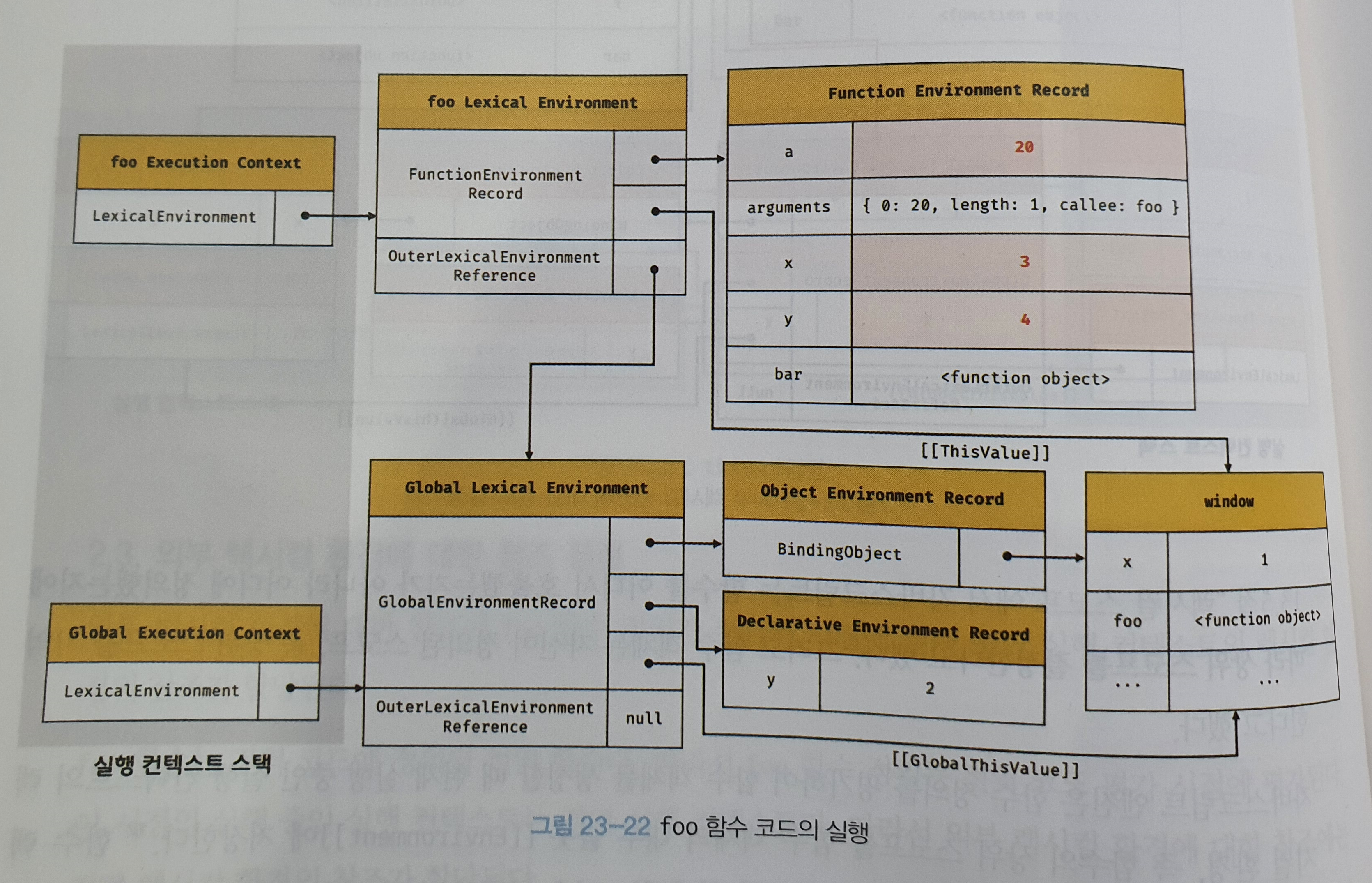 foo 함수 실행 컨텍스트를 생성한다. 생성된 함수 실행 컨텍스트는 함수 렉시컬 환경이 완성된 다음 실행 컨텍스트 스택에 푸시된다. 이때 foo 함수 실행 컨텍스트는 실행 컨텍스트 스택의 최상위, 즉 실행 중인 실행 컨텍스트가 된다.