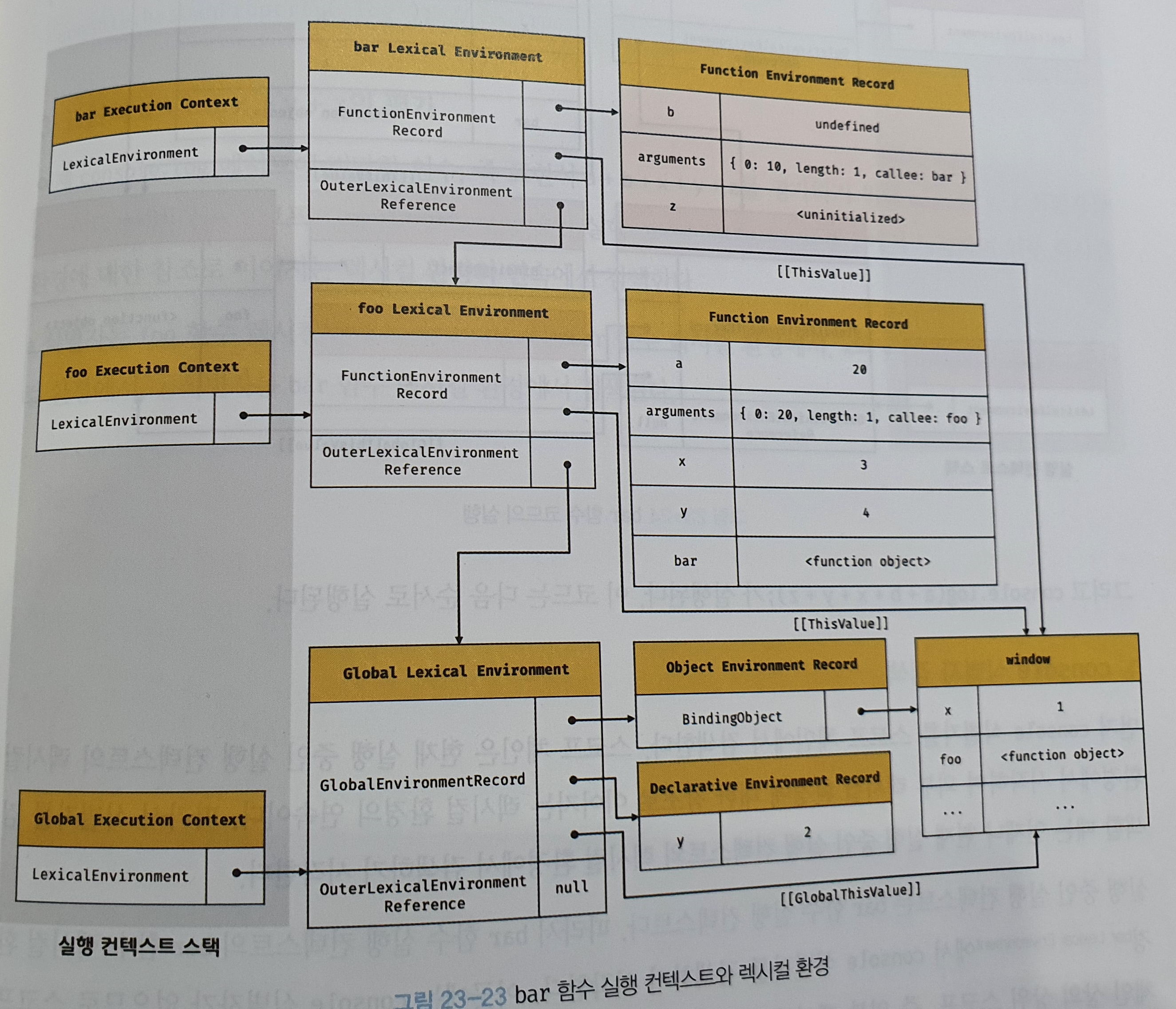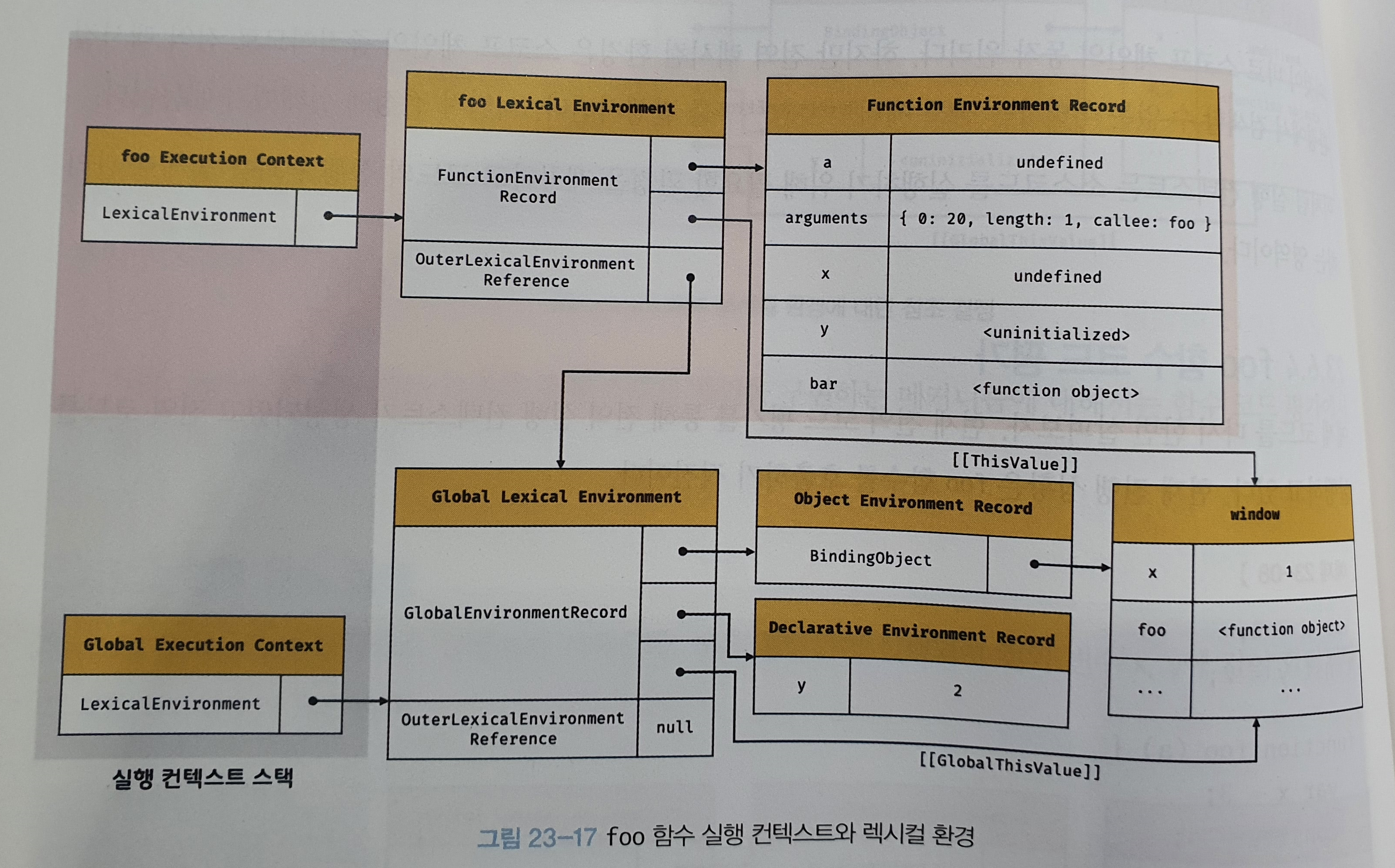 객체 환경 레코드는 BindingObject(전역 객체)라고 부르는 객체와 연결된다.