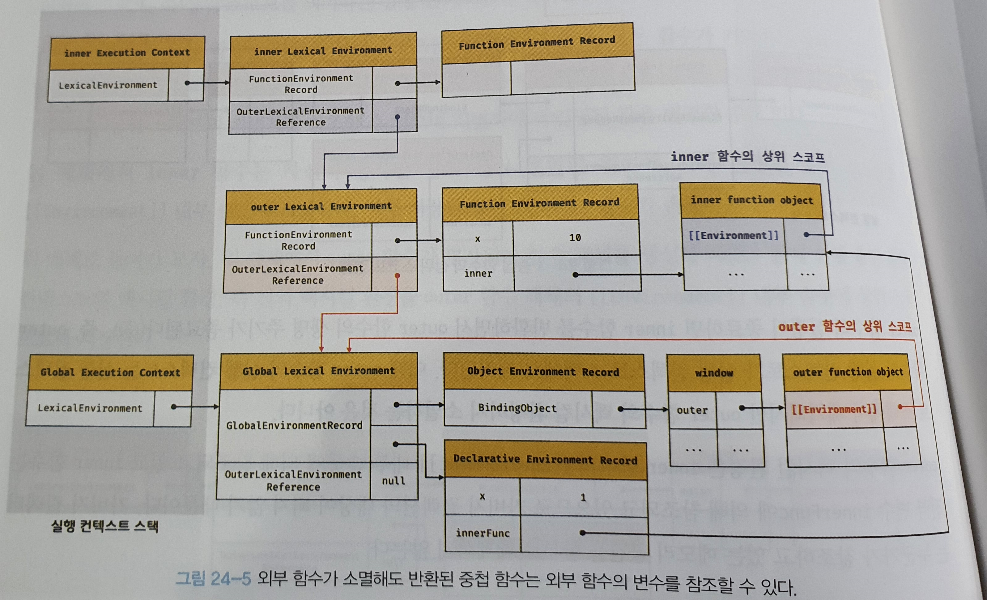 자바스크립트 엔진은 함수 정의를 평가하여 함수 객체를 생성할 때 현재 실행 중인 실행 컨텍스트의 렉시컬 환경, 즉 함수의 상위 스코프를 함수 객체의 내부 슬록 [[Enviornment]]에 저장한다.(379)