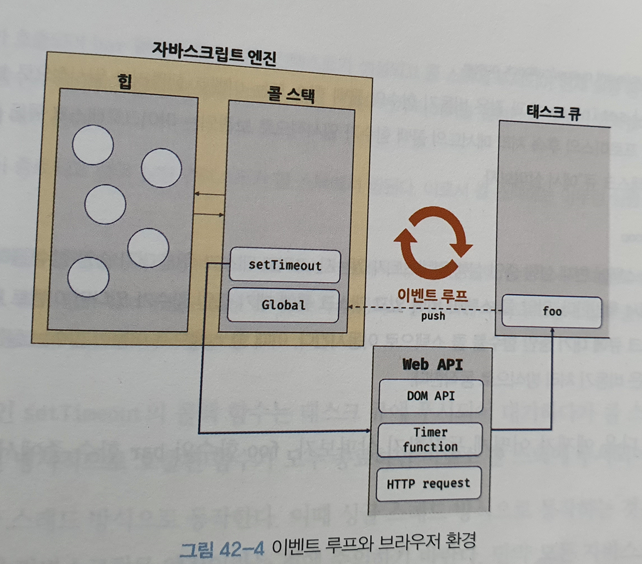 자바스크립트는 싱글 스레드 방식으로 동작한다. 이때 싱글 스레드 방식으로 동작하는 것은 브라우저가 아니라 브라우저에 내장된 자바스크립트 엔진이라는 것에 주의해야 한다. 만약 모든 자바스크립트 코드가 자바스크립트 엔진에서 싱글 스레드 방식으로 동작한다면 자바스크립트는 비동기로 동작할 수 없다. 즉, 자바스크립트 엔진은 싱글 스레드로 동작하지만 브라우저는 멀티 스레드로 동작한다.