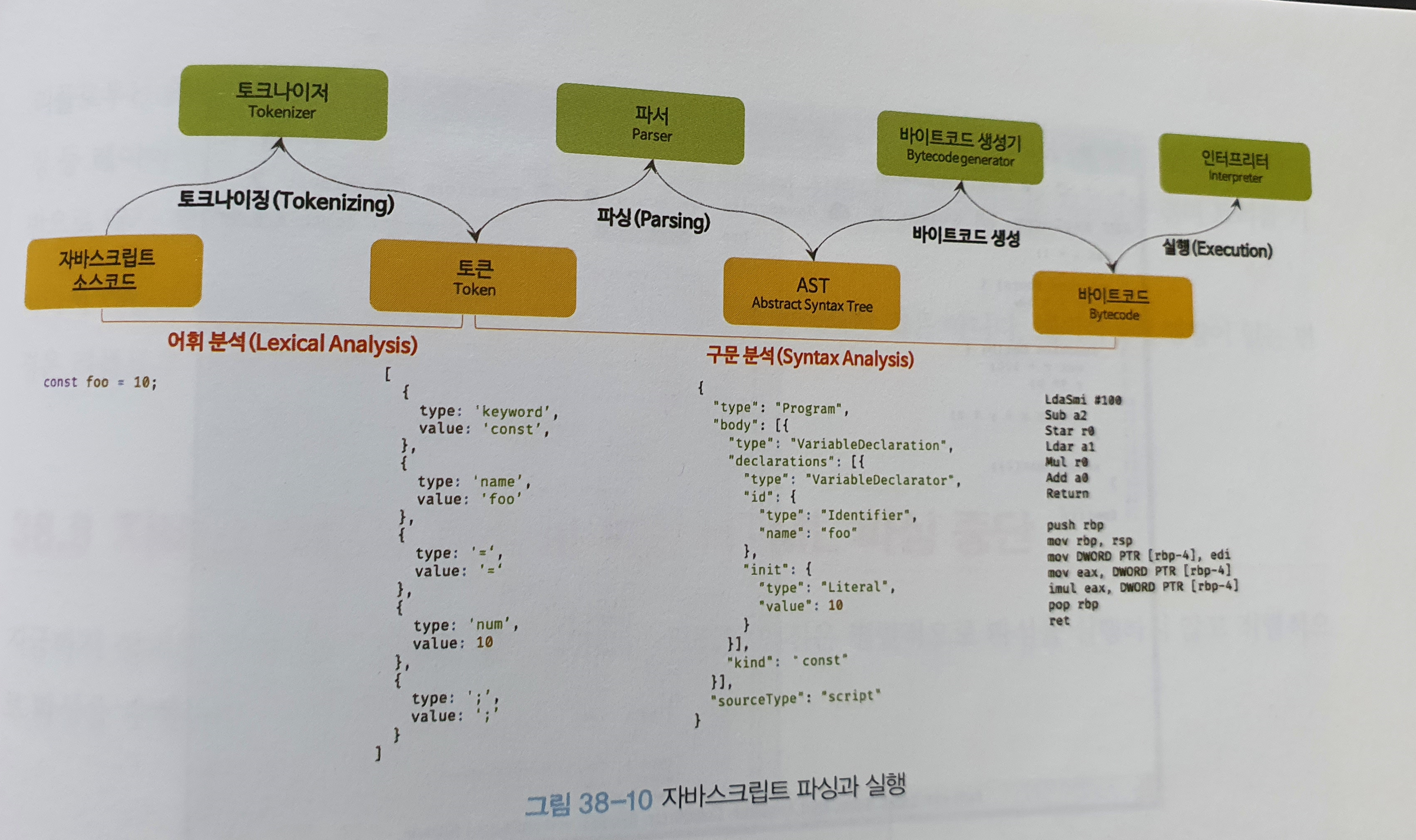 바이트코드 생성과 시행 : 파싱의 결과물로서 생성된 AST는 인터프리터가 실행할 수 있는 중간 코드인 바이트코드로 변환되고 인터프리터에 의해 실행된다.
