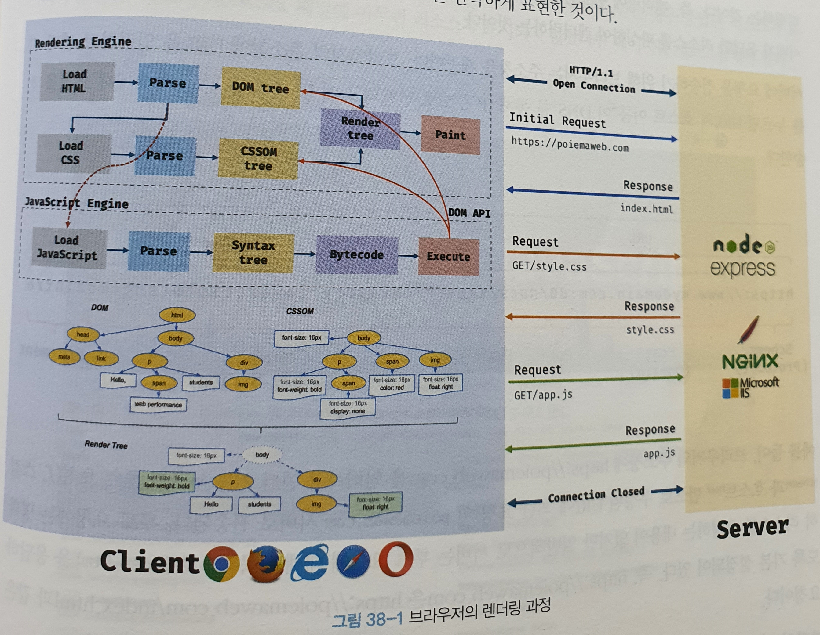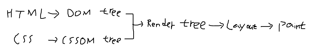 렌더링 엔진은 서버로부터 응답된 HTML과 CSS를 파싱하여 각각 DOM과 CSSOM를 생성한다. 그리고 DOM과 CSSOM은 렌더링을 위해 렌더 트리로 결합된다. 렌더 트리는 브라우저 화면에 렌더링되는 노드만으로 구성된다.