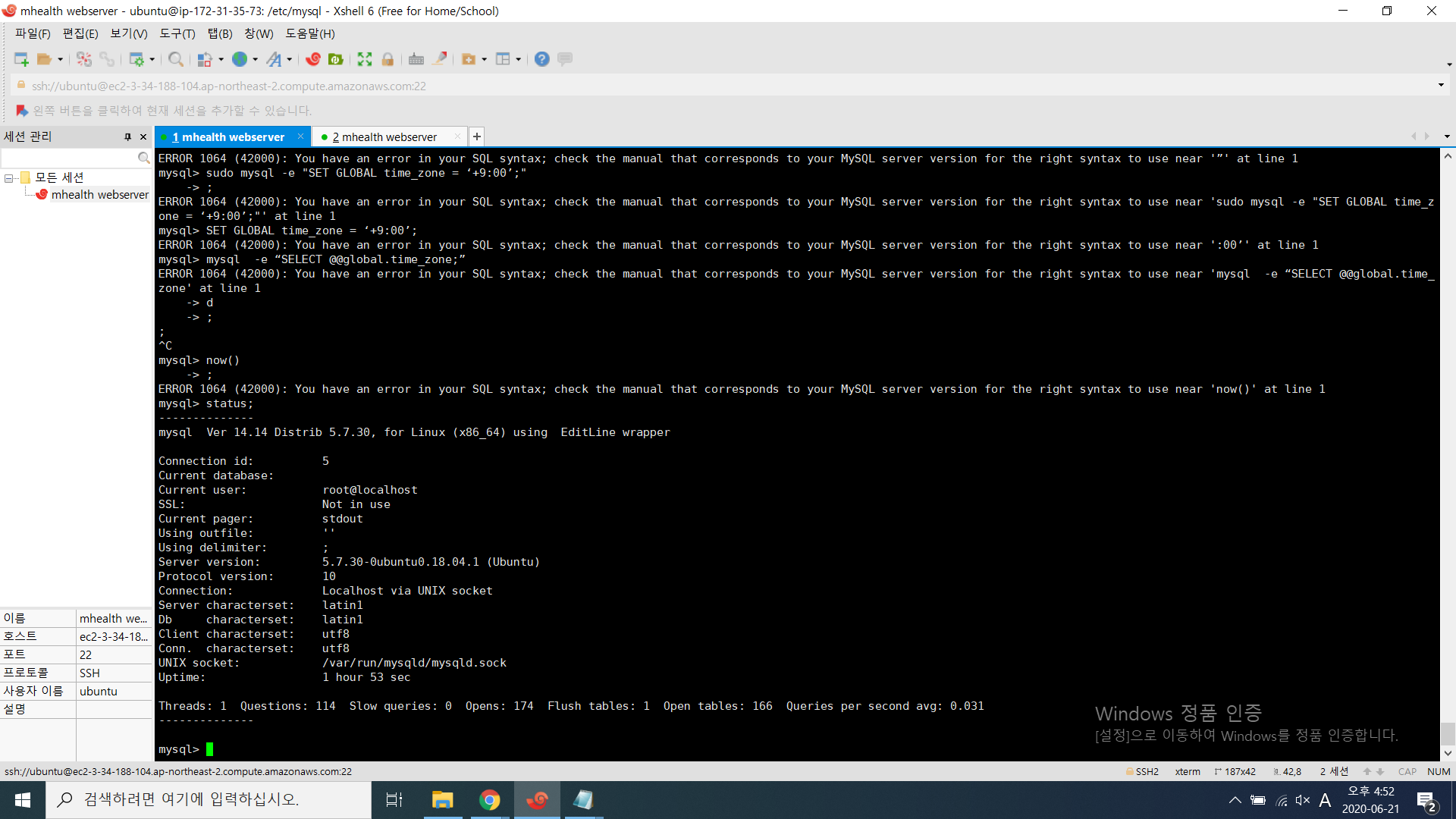 mysql시간이 한국 시간으로 맞춰져 있지 않습니다. 그래서 이것도 설정을 해야 합니다.