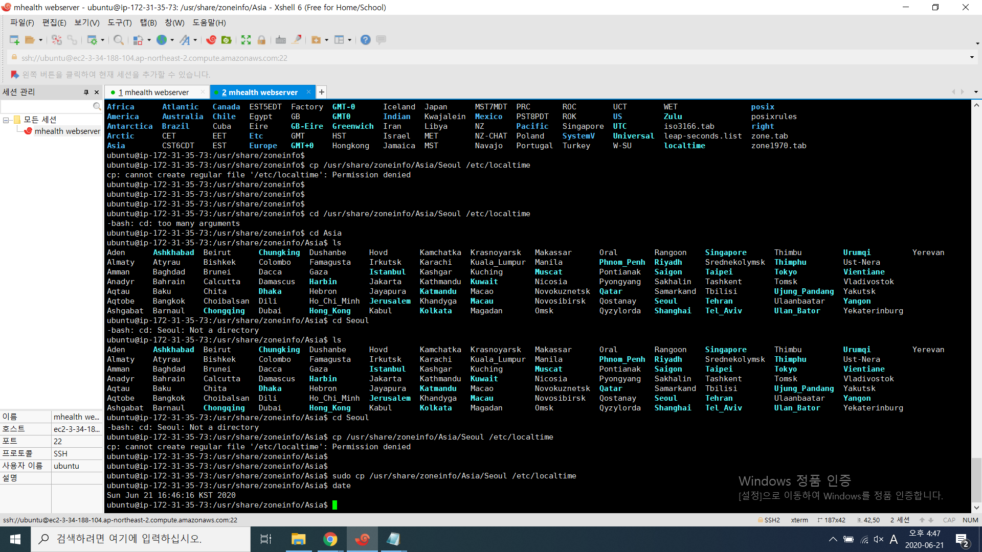 sudo cp /usr/share/zoneinfo/Asia/Seoul /etc/localtime