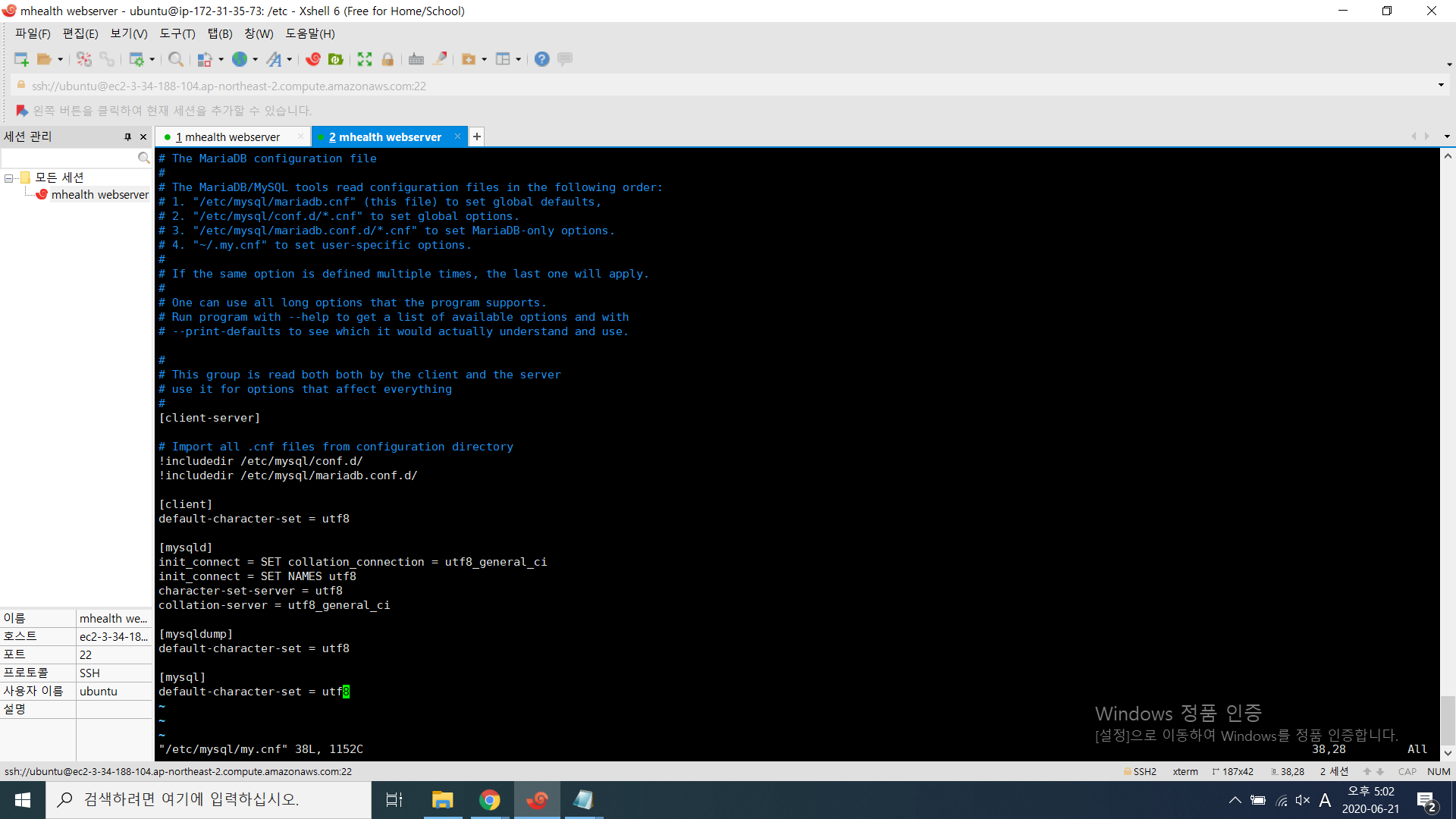 sudo vi /etc/mysql/my.cnf 으로 파일안에 들어가서 아래 코드를 복붙해줍니다.