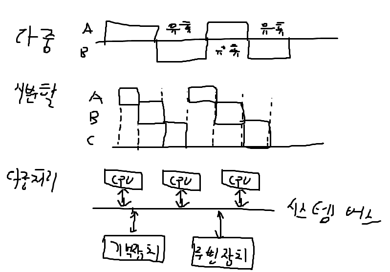 다중 프로그래밍 시스템 : 프로세서가 유휴상태일 때 둘 이상의 작업이 프로세서를 전환하여 사용할 수 있도록 동작.