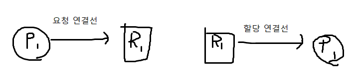G=(V,E) V=프로세스 집합, P={P1, P2, --}, 자원 집합 R={R1, R2, --}