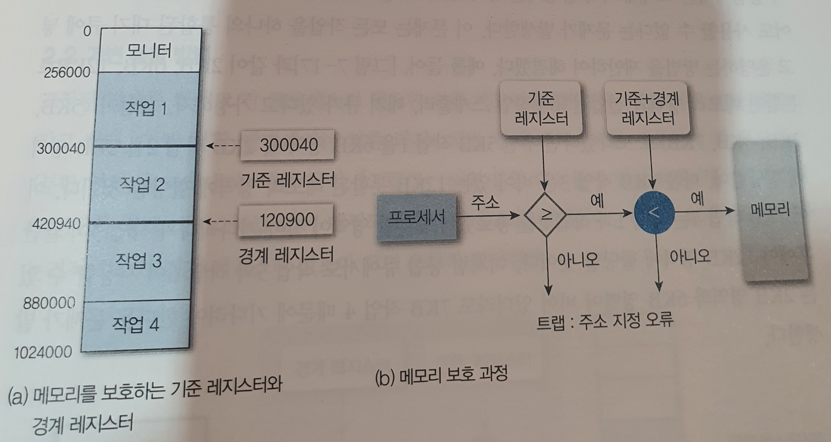 => 여러 프로세스가 메모리에 상주하므로 이 프로세스를 보호할 수 있는 메모리 보호 방법이 필요.