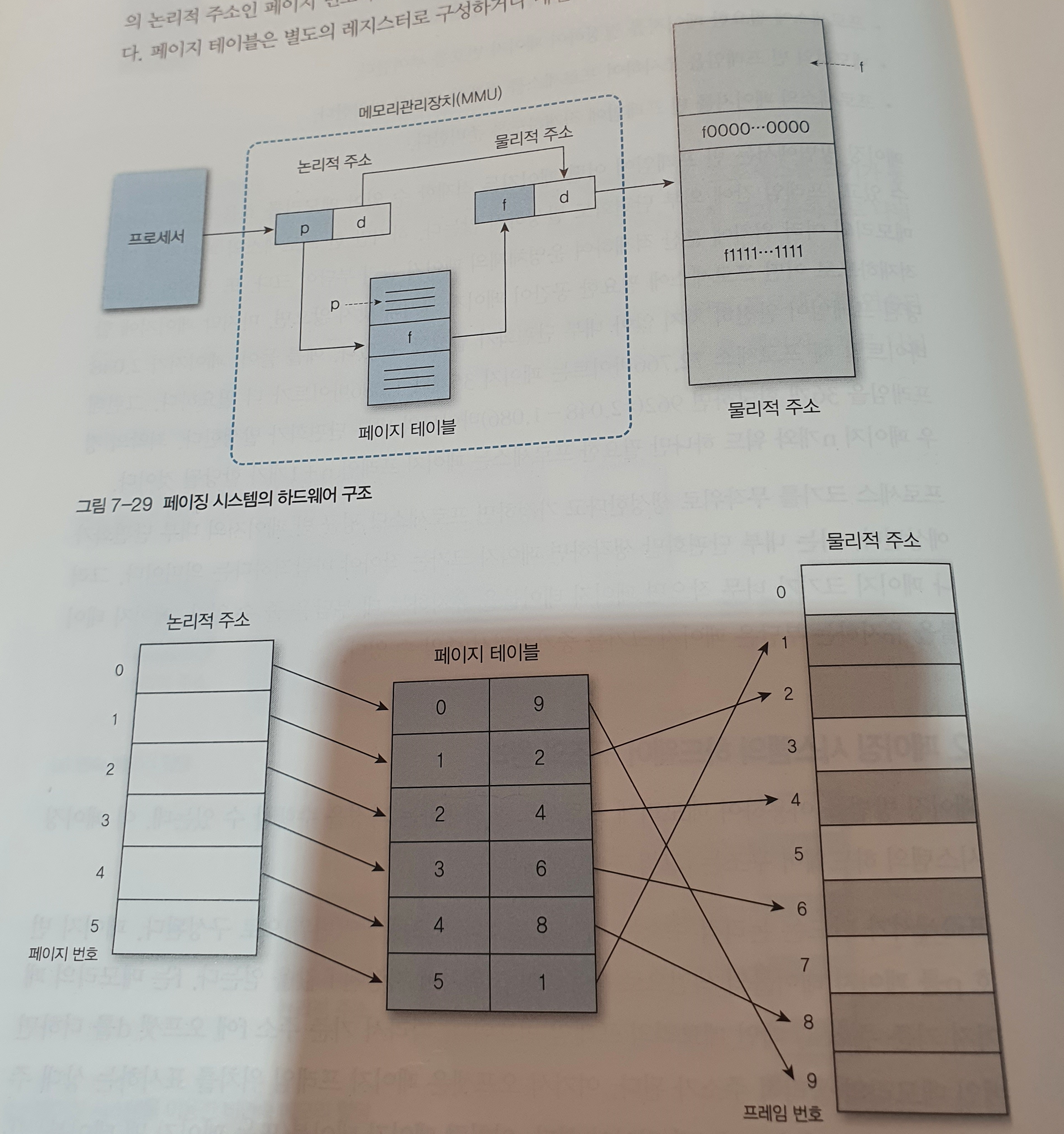 -- 프로세서가 만드는 논리적 주소는 페이지 번호와 오프셋으로 구성. 페이지 번호 p를 페이지 테이블의 색인으로 사용하여 p 위치에 저장된 f 값을 얻는다. f는 메모리의 페이지 기준 주소로, 메인 메모리의 프레임 번호이다. 따라서 기준 주소 f에 오프셋 d를 더하면 메인 메모리의 물리적 주소가 된다. 이때 오프셋은 페이지 프레임 크기보다 작아야 한다.
