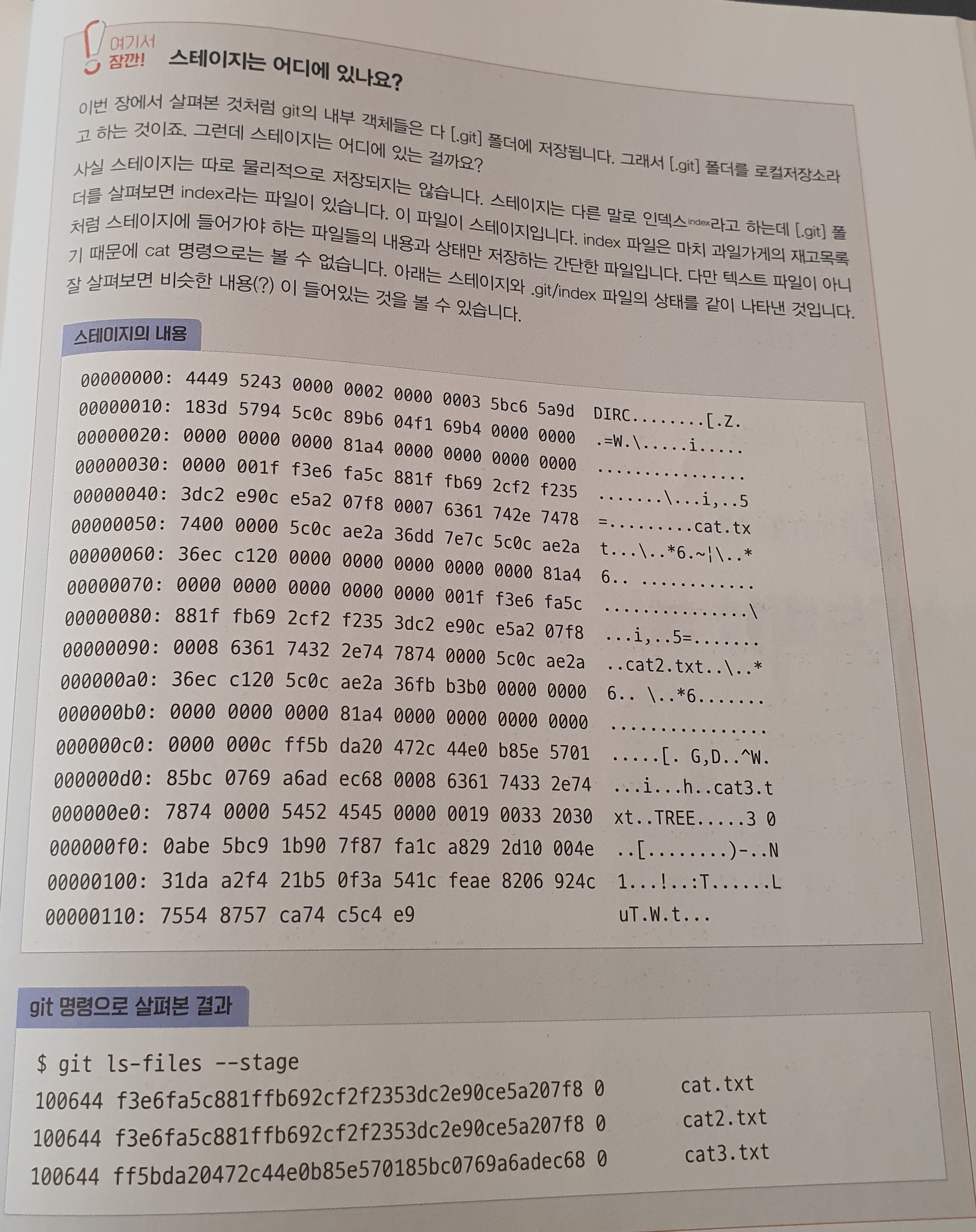 해당 파일의 체크섬 값과 동일한 이름을 가지는 blob 객체가 생성되고 이 객체는 .git/objects 파일에 저장. 그리고 스테이지의 니용은 .git/index에 기록