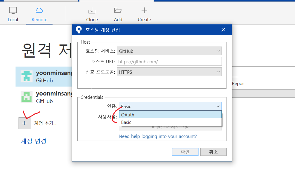 remote를 누르고 계정추가를 누른다음 oauth 혹은 basic으로 추가할 수 있다. basic은 그냥 아이디 비밀번호를 입력하면 된다.