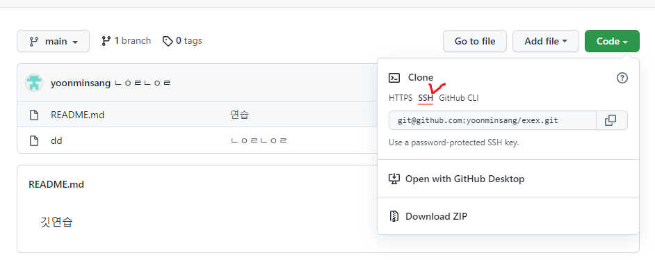 깃허브에서 clone 혹은 처음에 레파지토리를 생성하고 origin을 연결할 때 ssh라는 속성이 존재한다. 이 기존 주소에서 주소로 대체하면 끝이다. 결국 git@이 앞에붙는것말고는 달라지는게 없는 것 같다.