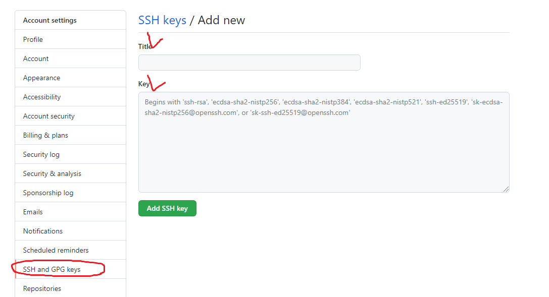 이번에는 pub파일을 전부 복사해서 깃헙-settings-SSH and GPG keys를 들어가서 key에 넣어준다. 제목은 식별자라 아무거나 넣어줘도 된다.