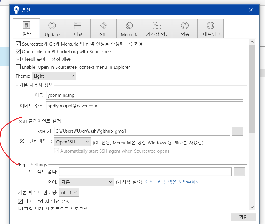 이제 도구 옵션을 눌러서 SSH 설정을 openSSH로 해주면 된다. 키는 상황에 맞게 변경하면 된다. 두개의 계정을 사용하는 것만이 목적이라면 하나는 SSH로, 하나는 기본 https로 사용해도 괜찮다. SSH는 애초에 보안목적으로 사용하는거라 만약 보안을 신경쓰고 두 개의 계정을 사용해야 한다면 번거롭지만 ssh키를 매번 바꿔줘야 한다.