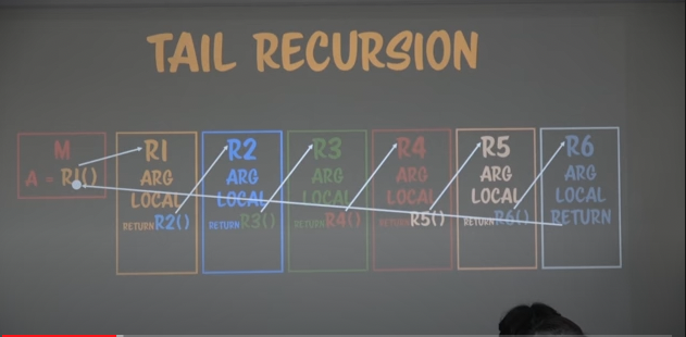 tail recursion(꼬리 재귀)를 살펴보자. 위의 sub routin chain과 유사하다. 다른점은 return할때 루틴을 실행하는 것이다. 이게 무슨 의미가 있을까?? 의미가 있을수도 없을 수도 있다. 단, 우리는 자바스크립트 관점에서 OOP 강의를 듣고있다. 그게 중요하다.